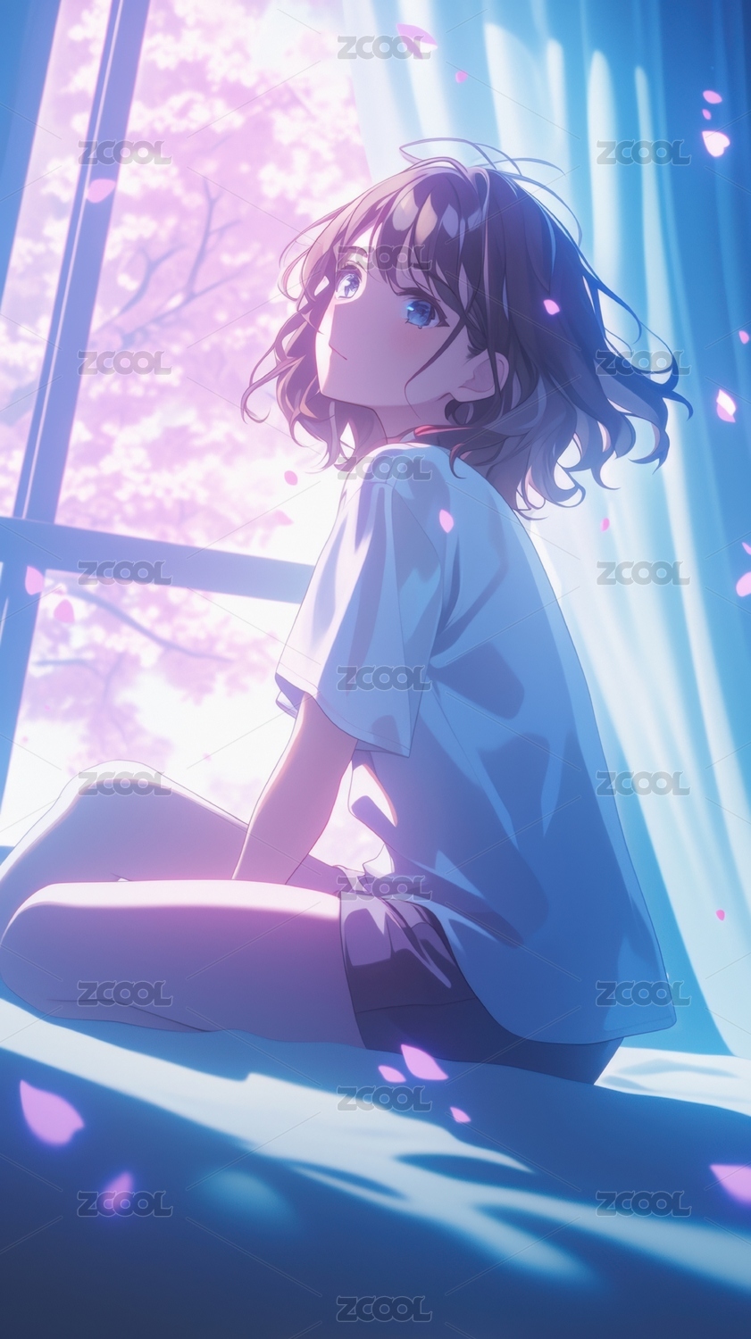 卡通,插画,动漫,漫画,现代,少女,长发,灯光,蓝色,星辰