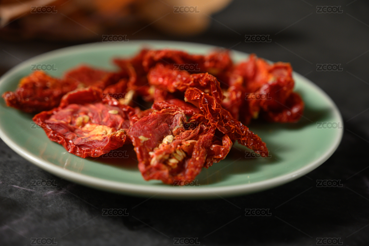 桌面上的盘子里的美味可口的西红柿干