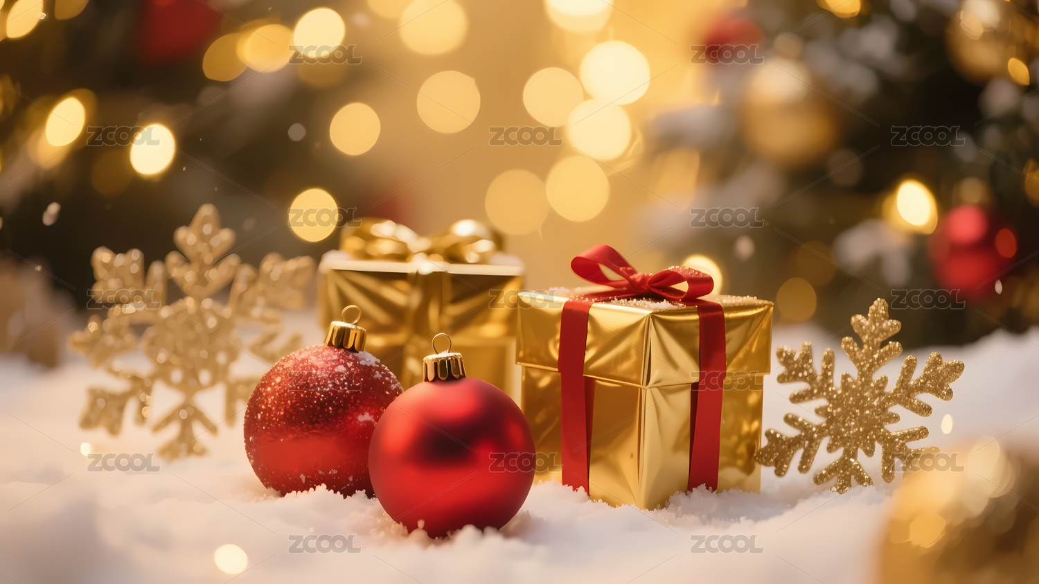 礼物盒,蝴蝶结,灯光,雪花,节日,温馨,红色,金色,装饰球,银色