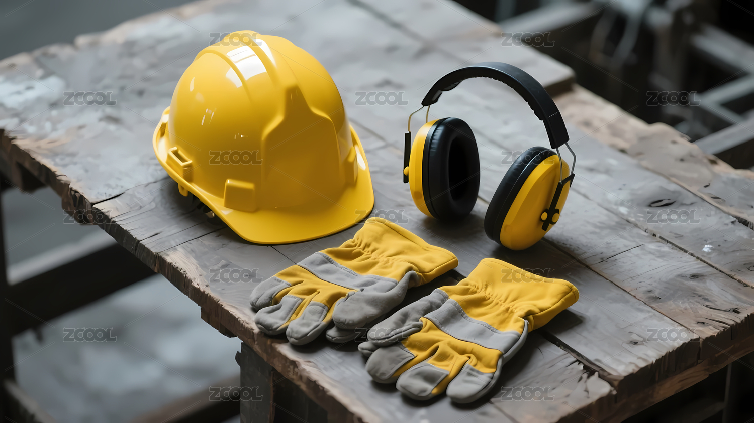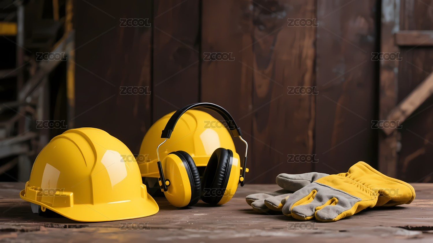 安全帽,耳罩,手套,木质,背景,防护,黄色,粗糙,放置,工具