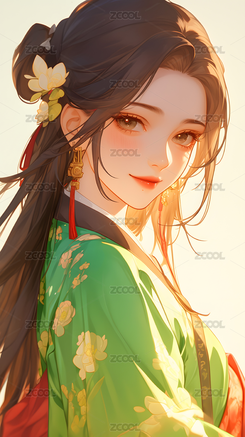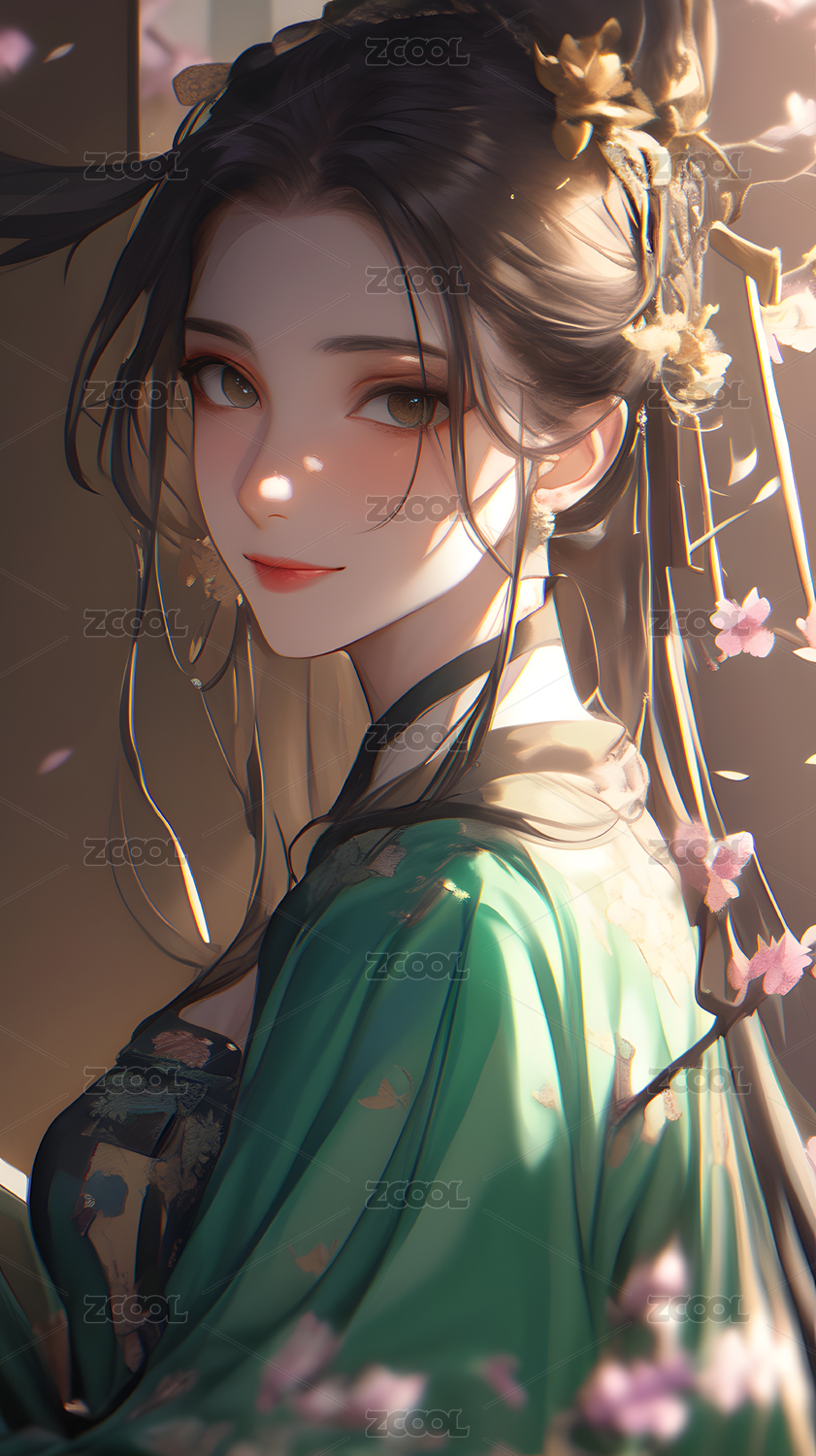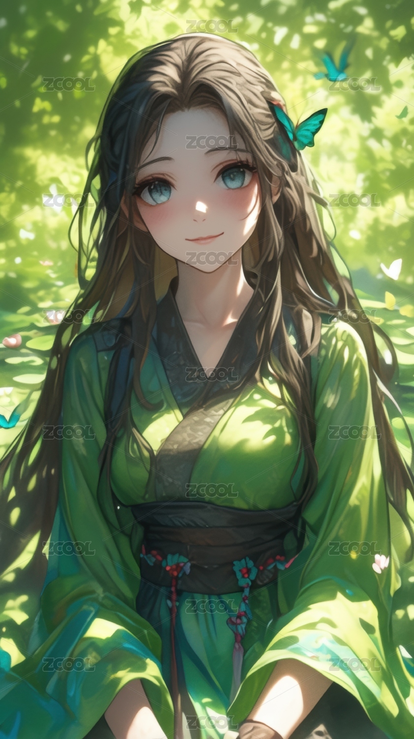 穿着绿色和服的美丽女孩