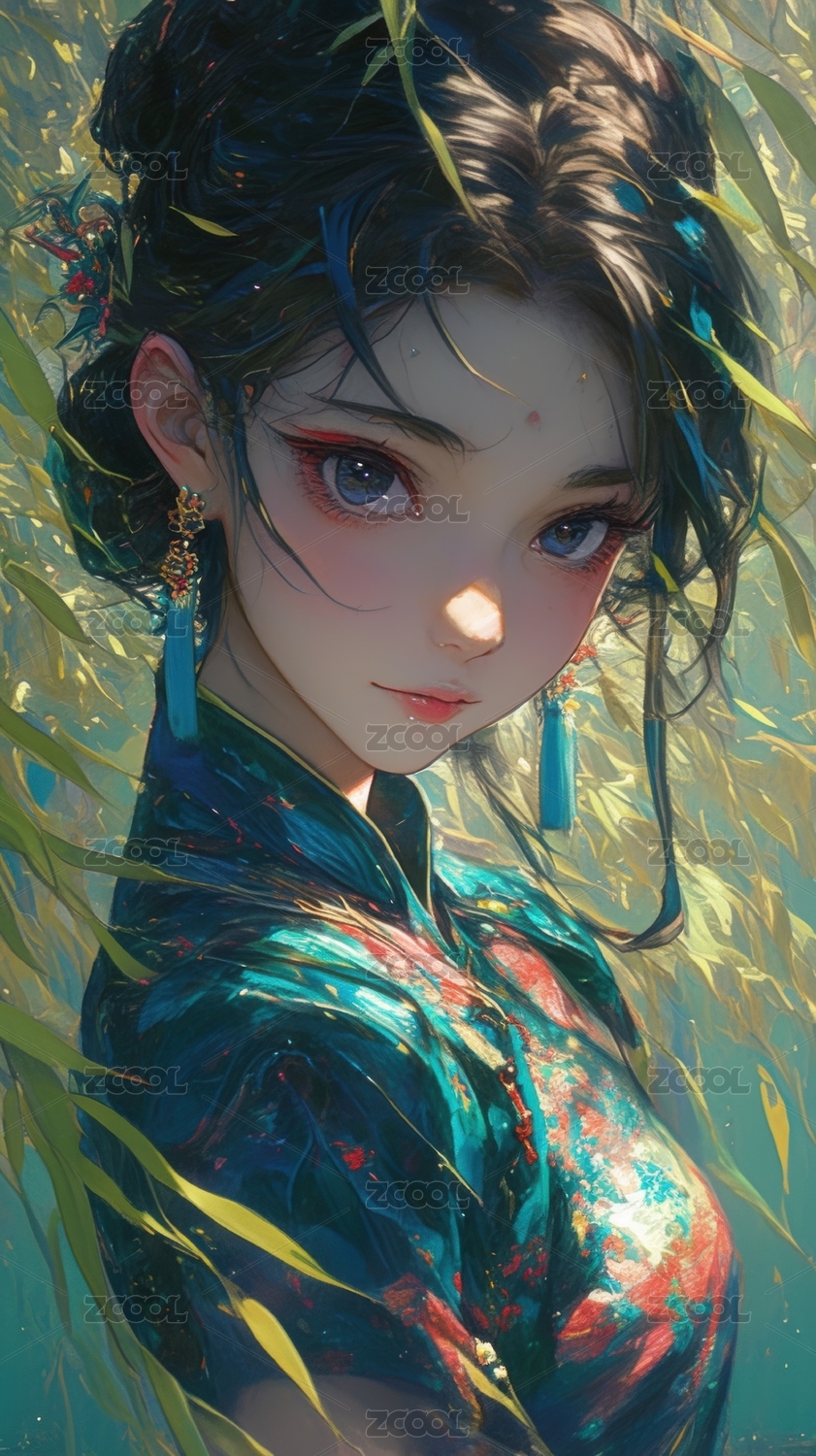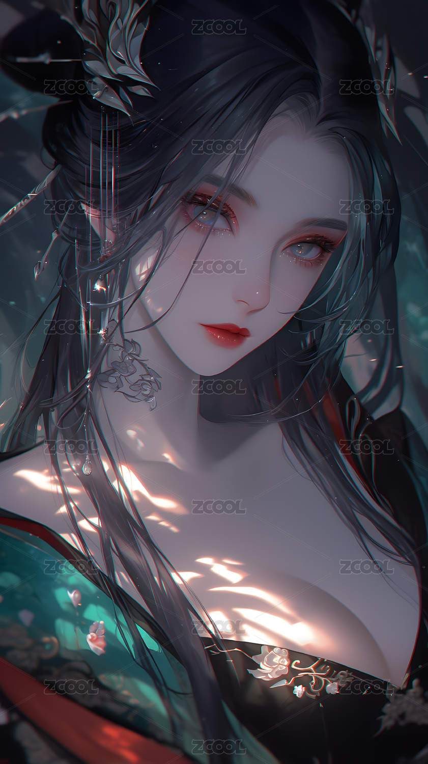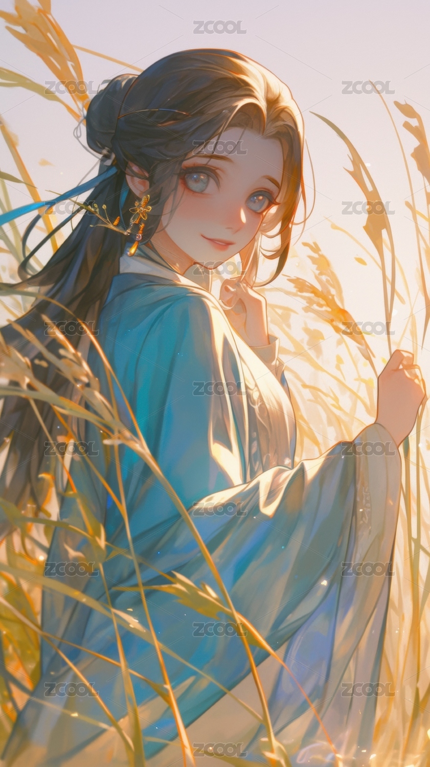 蓝眸长发人物的梦幻艺术插画