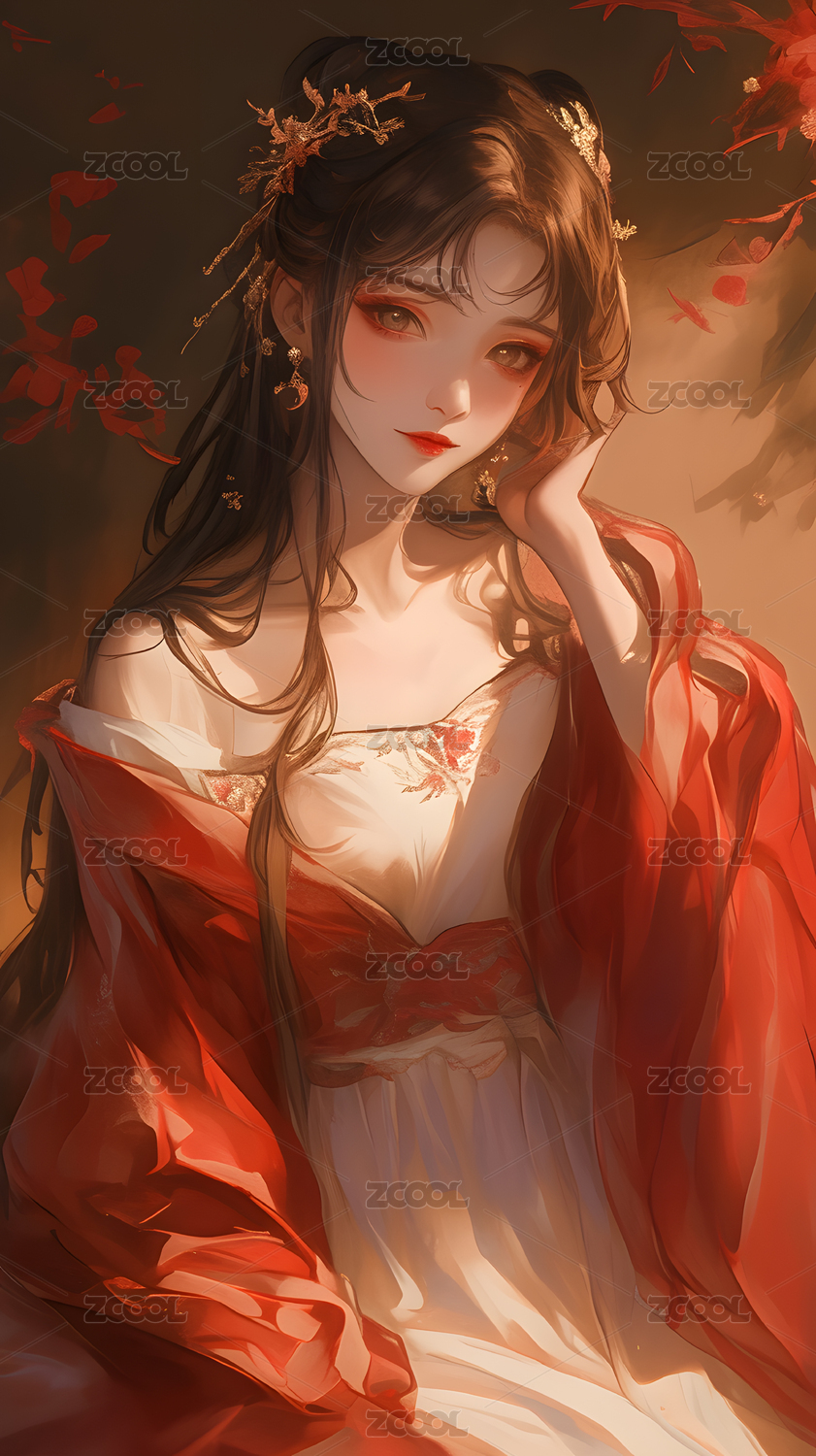 红衣女子古典妆容与华丽服饰