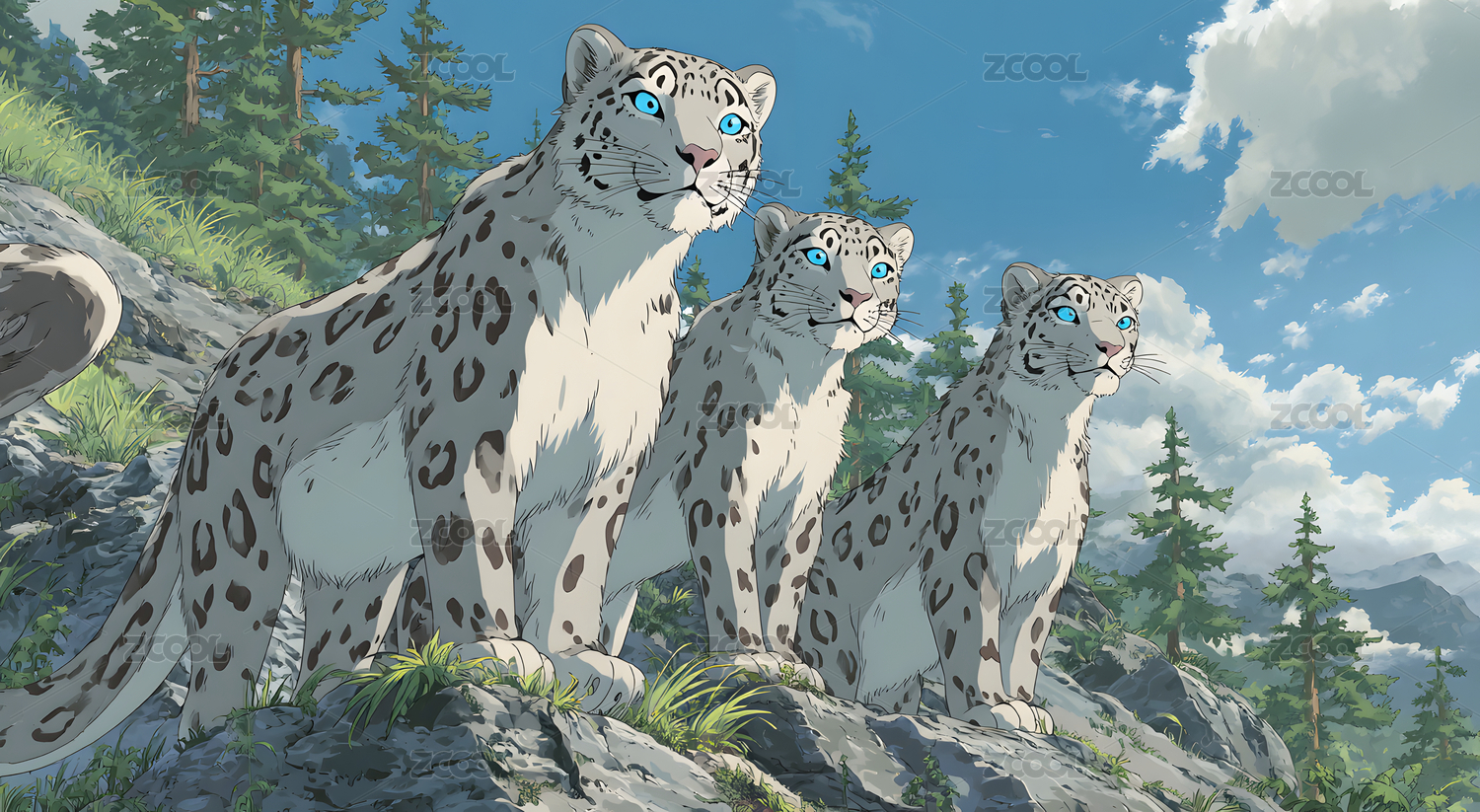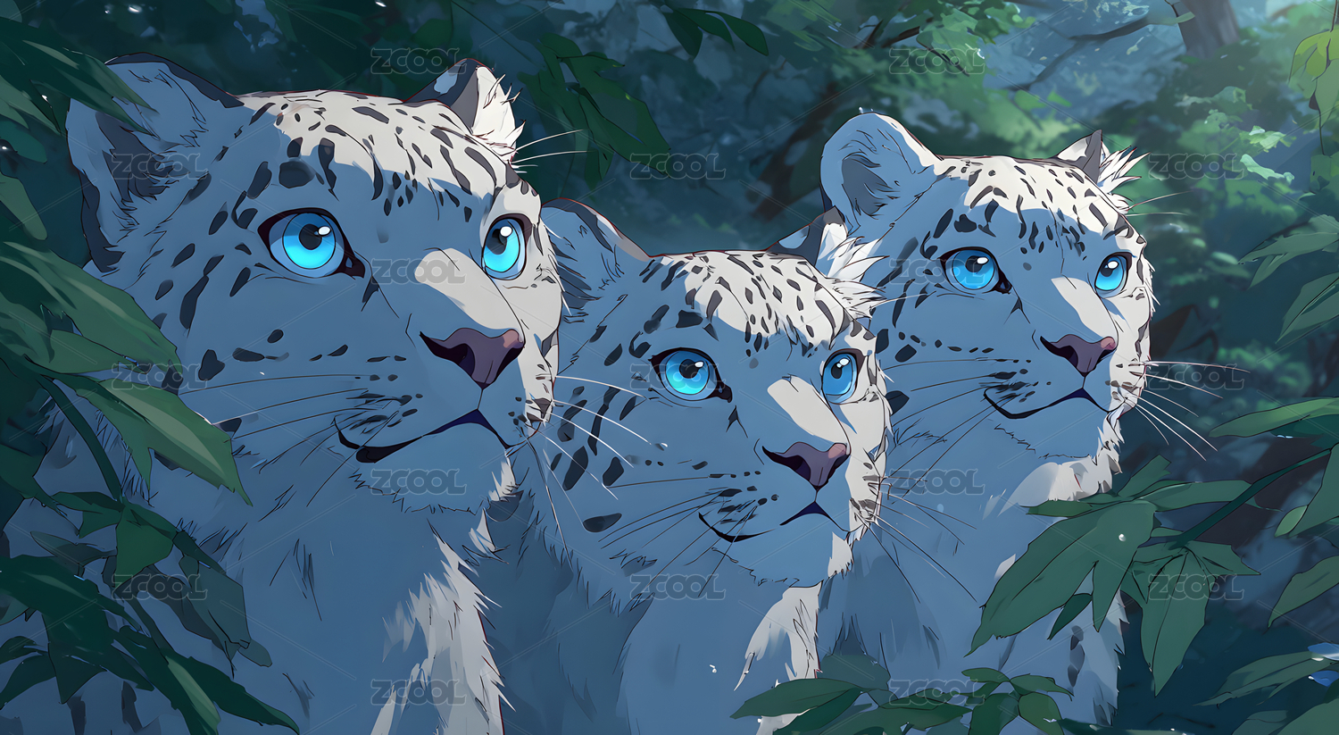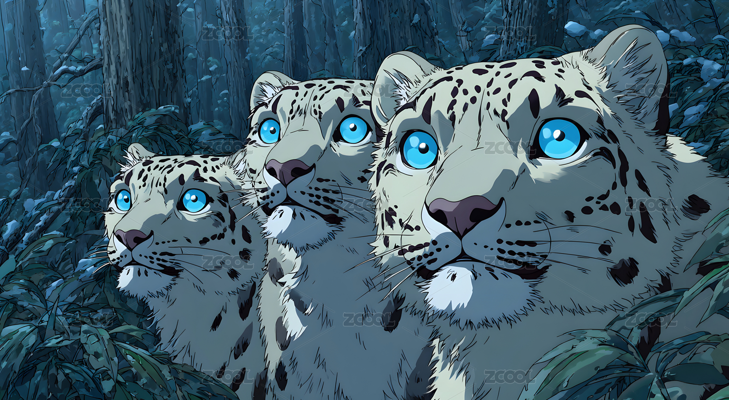 三只雪豹注视前方