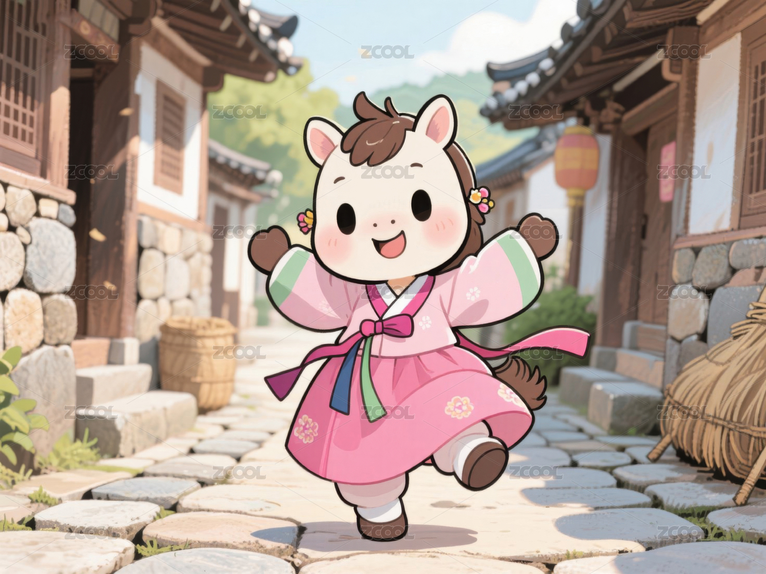 萌马,笛子,古建筑,传统,服饰,鼓,河流,卡通,文化,背景
