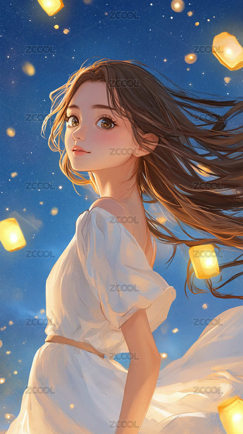 女子手持灯笼夜空飘满灯盏