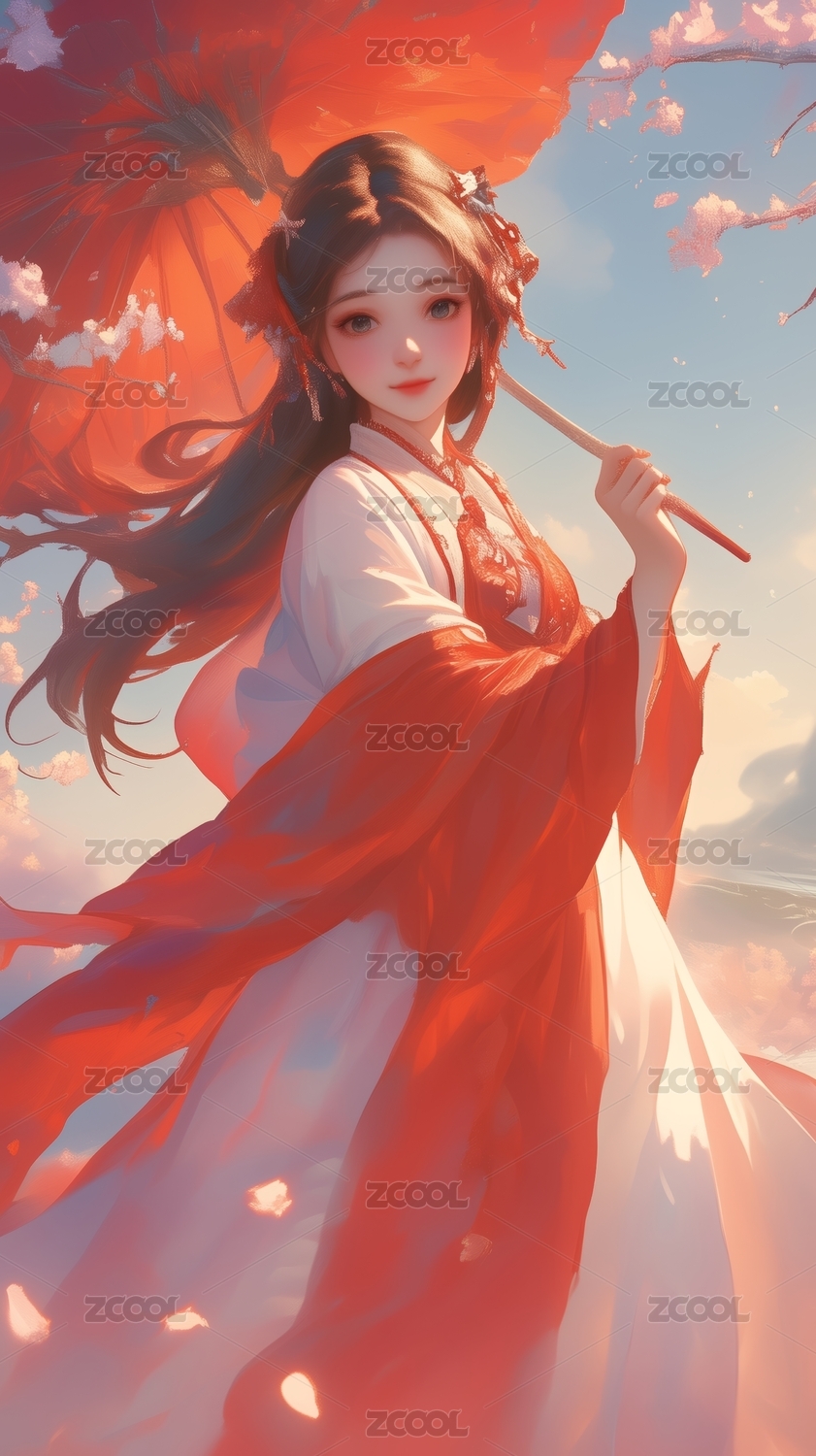 火红盛装女子梦幻场景