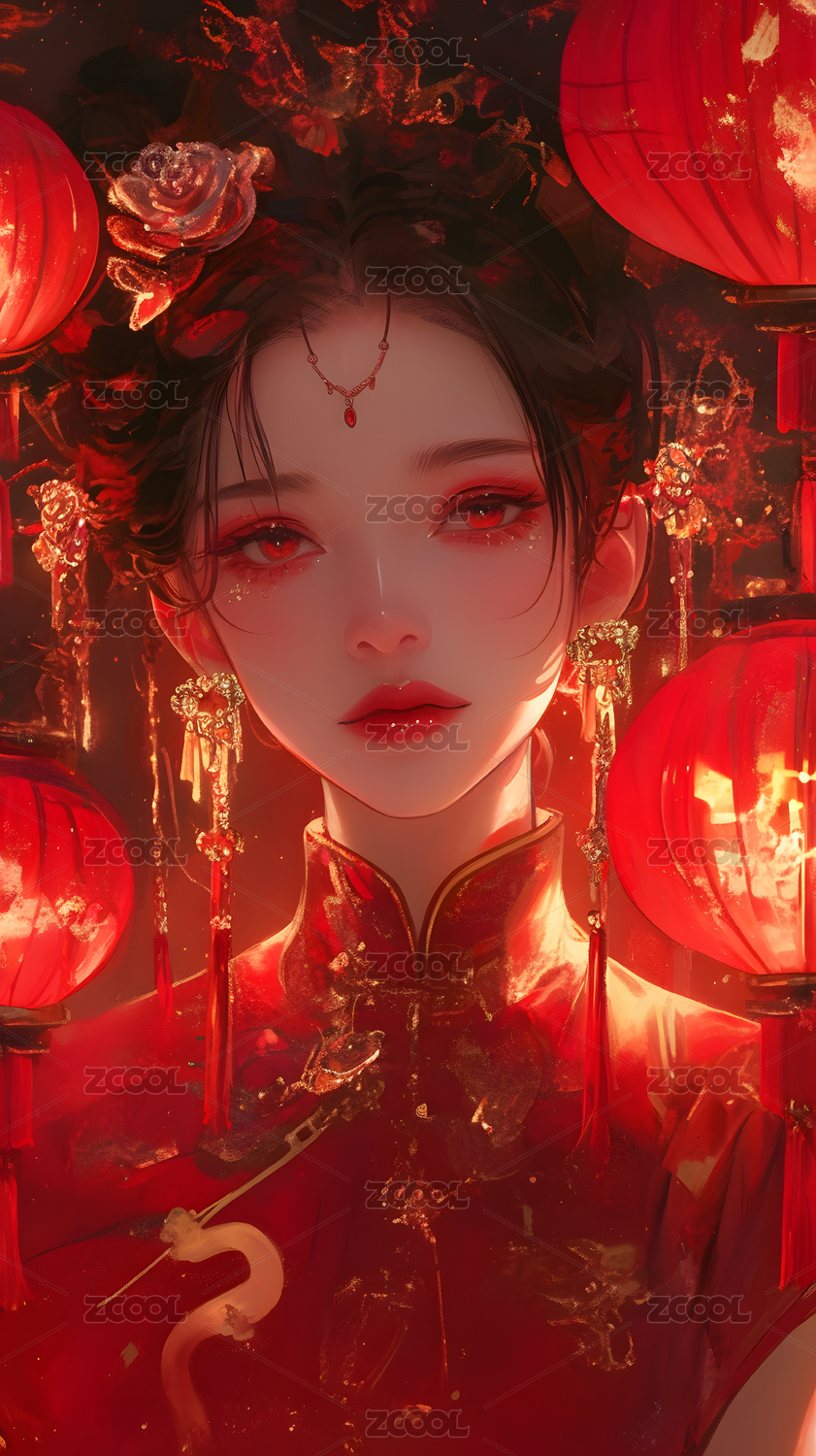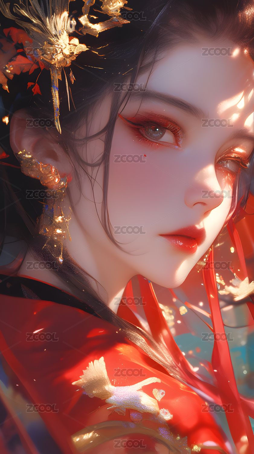 红衣女子华丽服饰与精致妆容