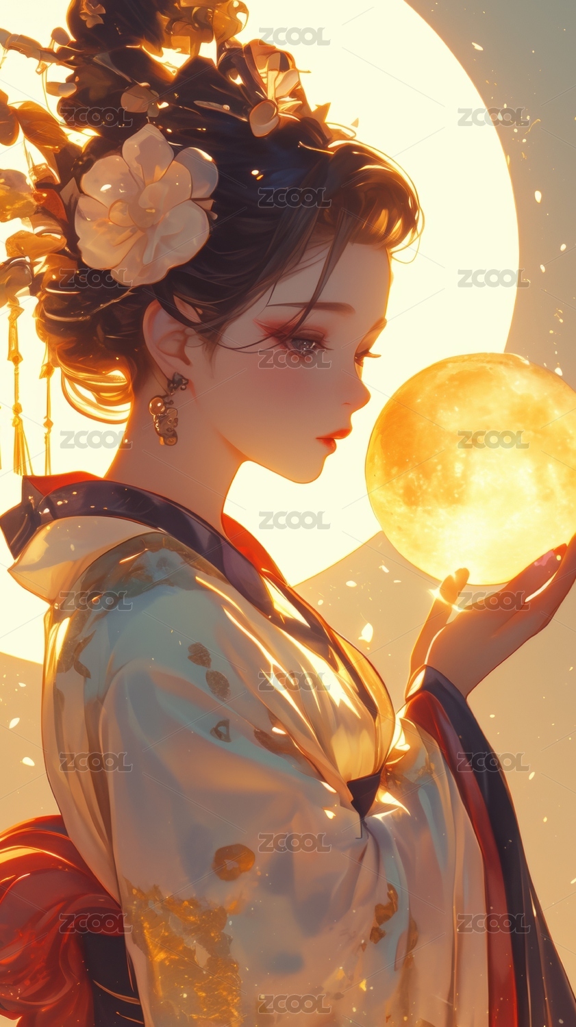 古风女子手捧明月月下花影