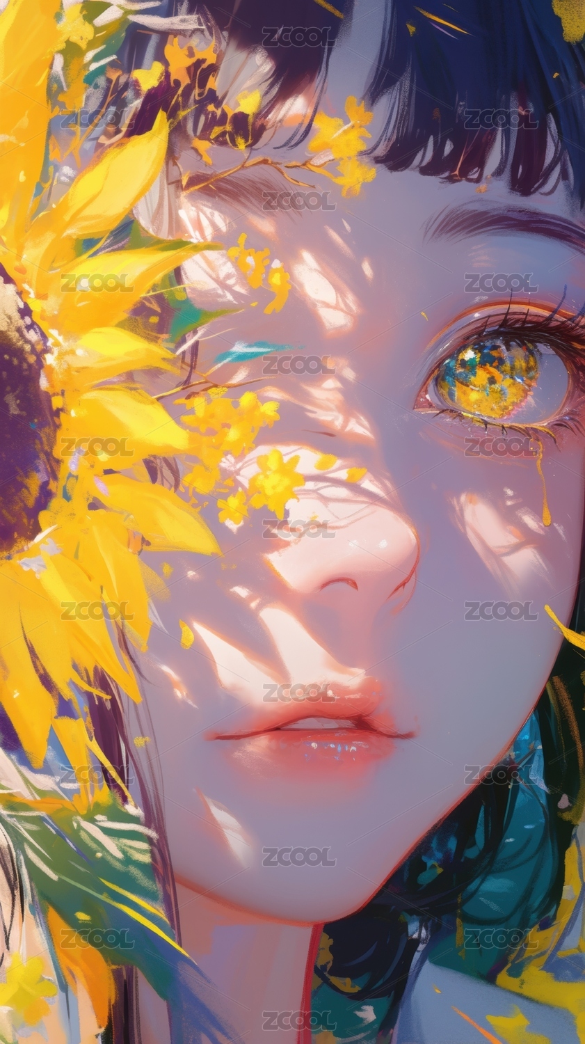 梦幻色彩中的金色花饰少女