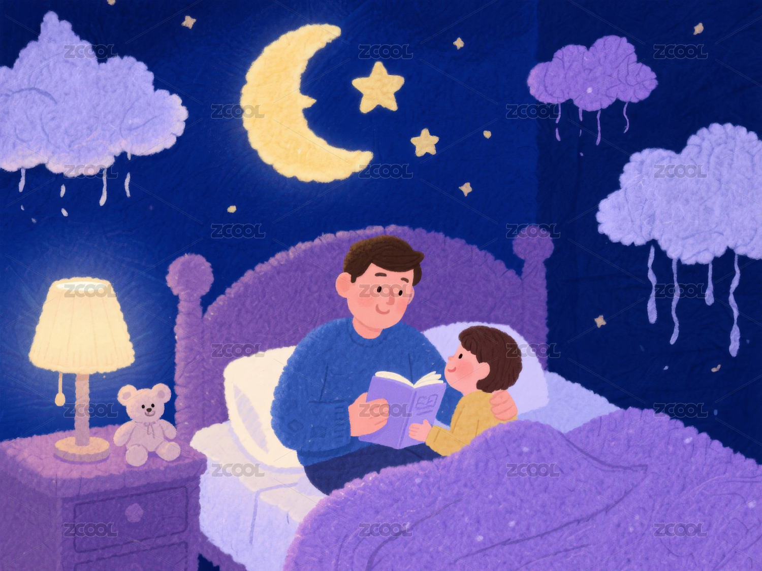 父亲,孩子,读书,床,夜景,月亮,星星,玩具熊,台灯,被子