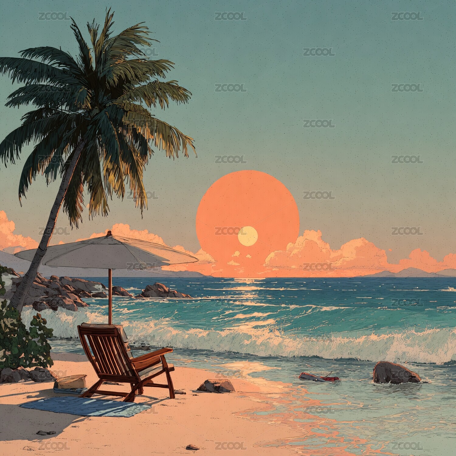 海滩,沙滩,棕榈树,遮阳伞,躺椅,大海,太阳,云朵,插画,休闲