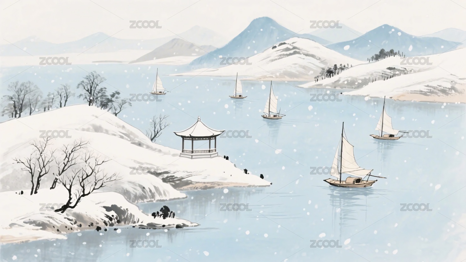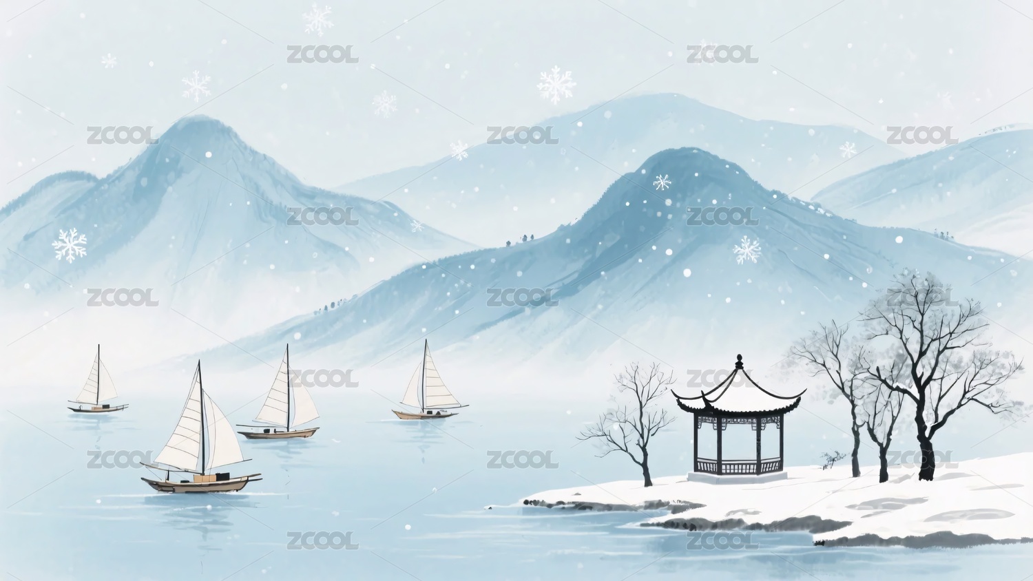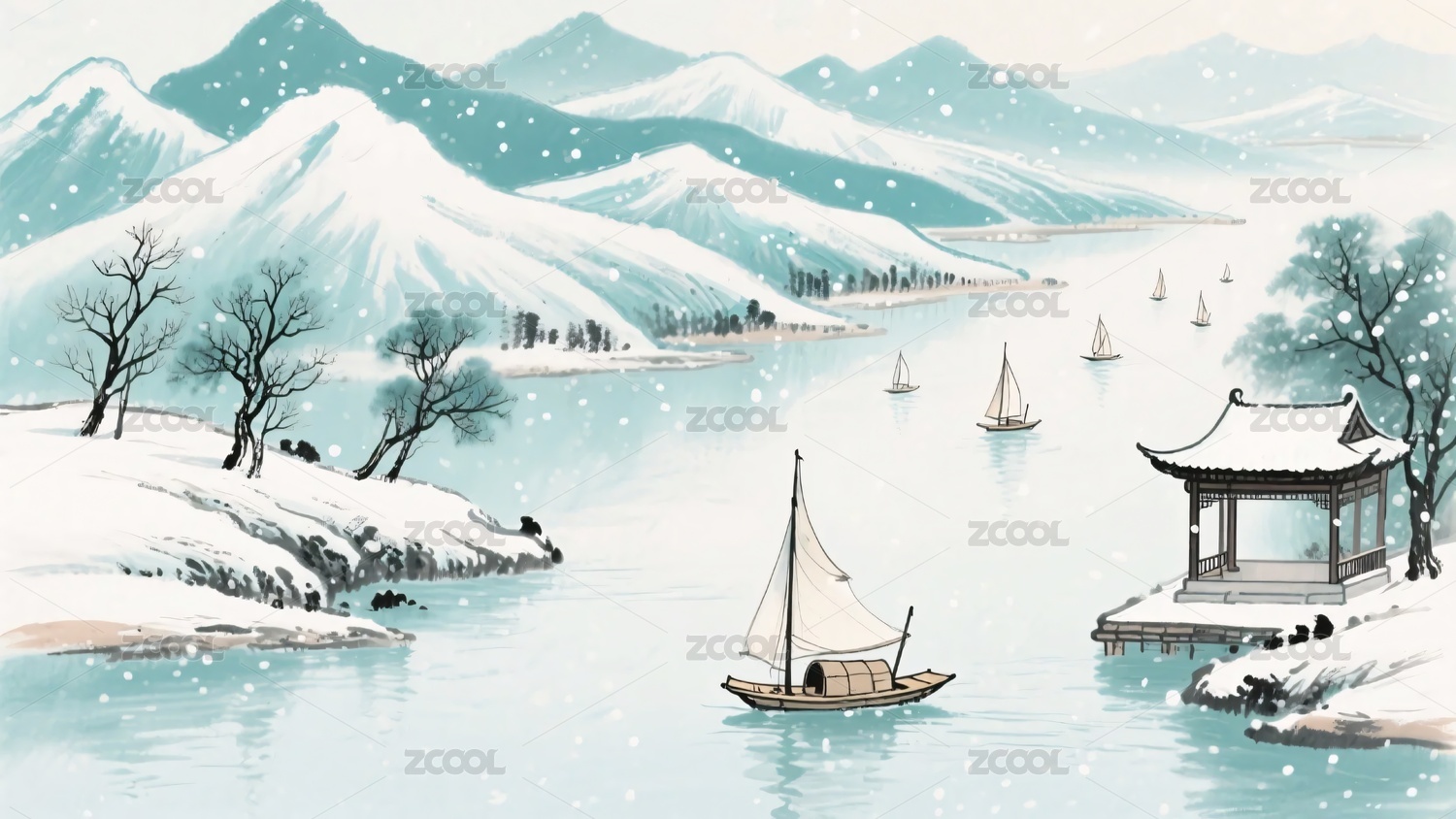 山水,江景,帆船,亭子,雪景,插画,矢量,水墨画,风景,冬季