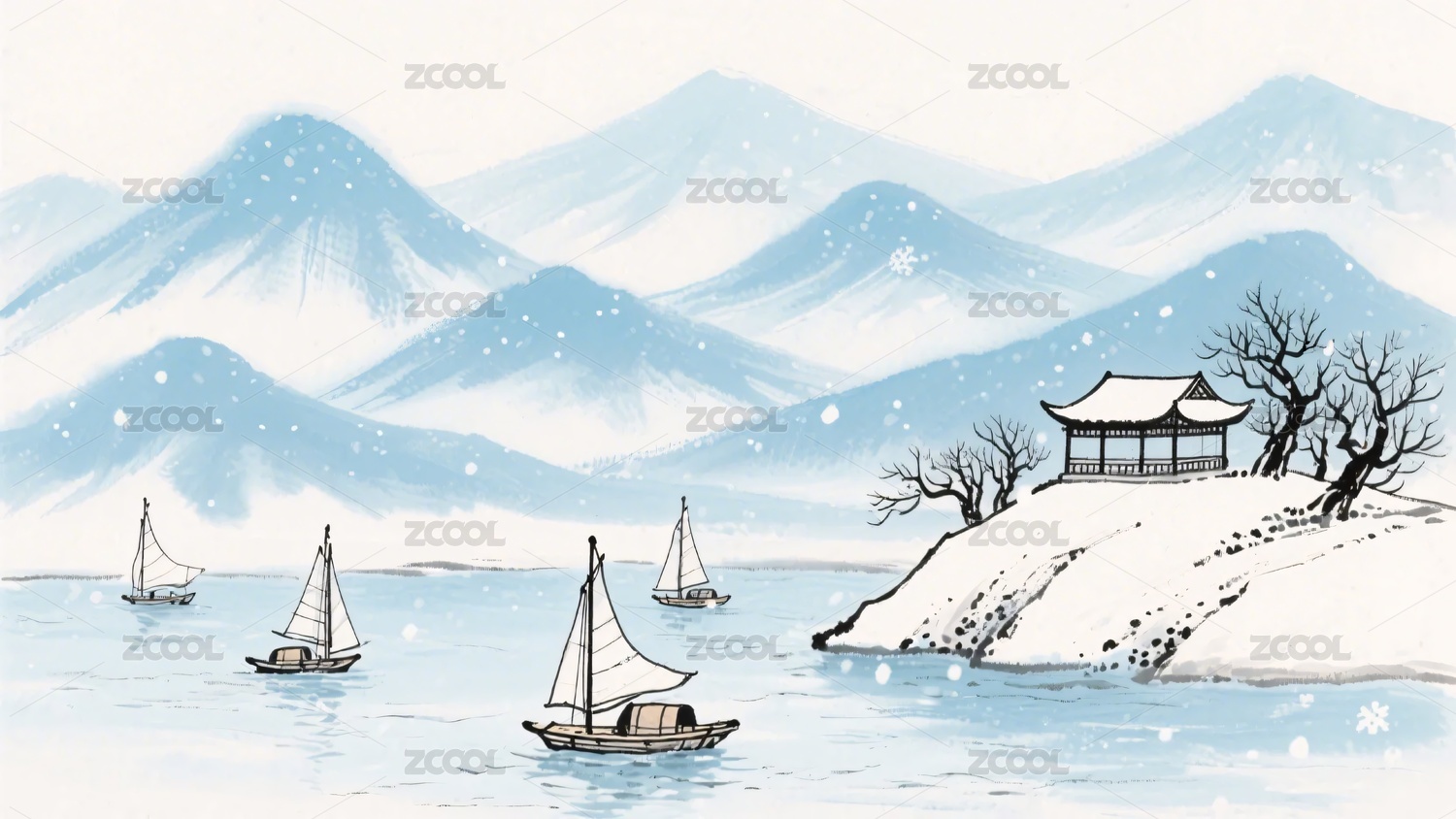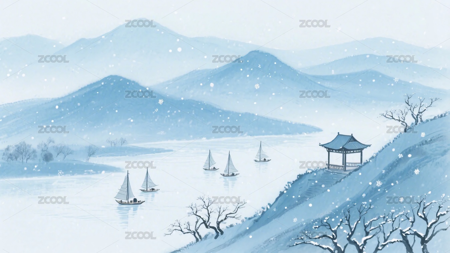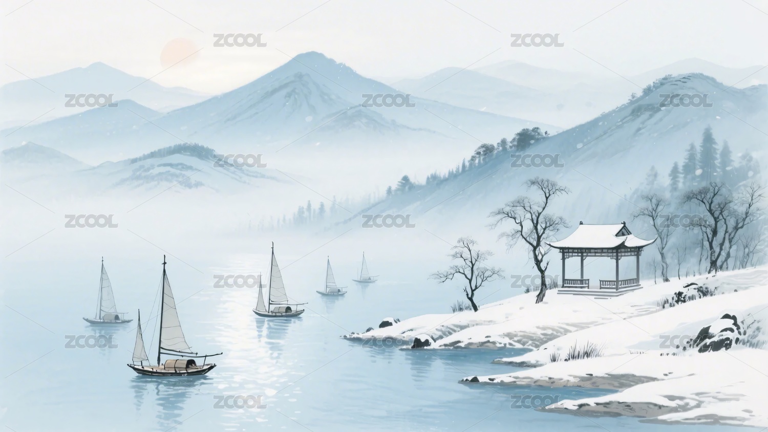 山水,江景,帆船,亭子,雪景,插画,矢量,水墨画,风景,冬季