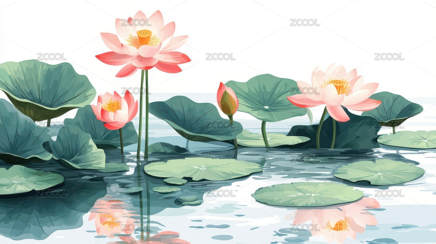 白莲花,荷叶,水面,插画,自然,花卉,唯美,清新,静谧,宁静