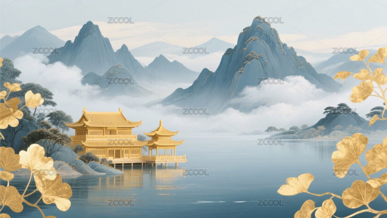 山水,荷花,亭子,云雾,插画,背景,中式,古风,矢量,金色