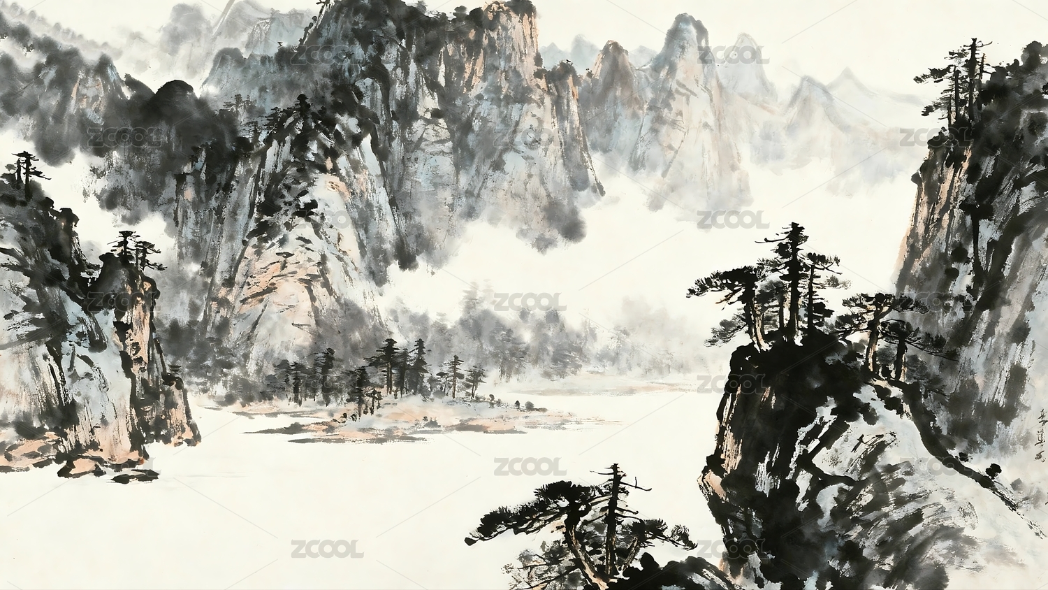 山水,飞鸟,小船,水墨画,风景,自然,意境,艺术,中式,古风