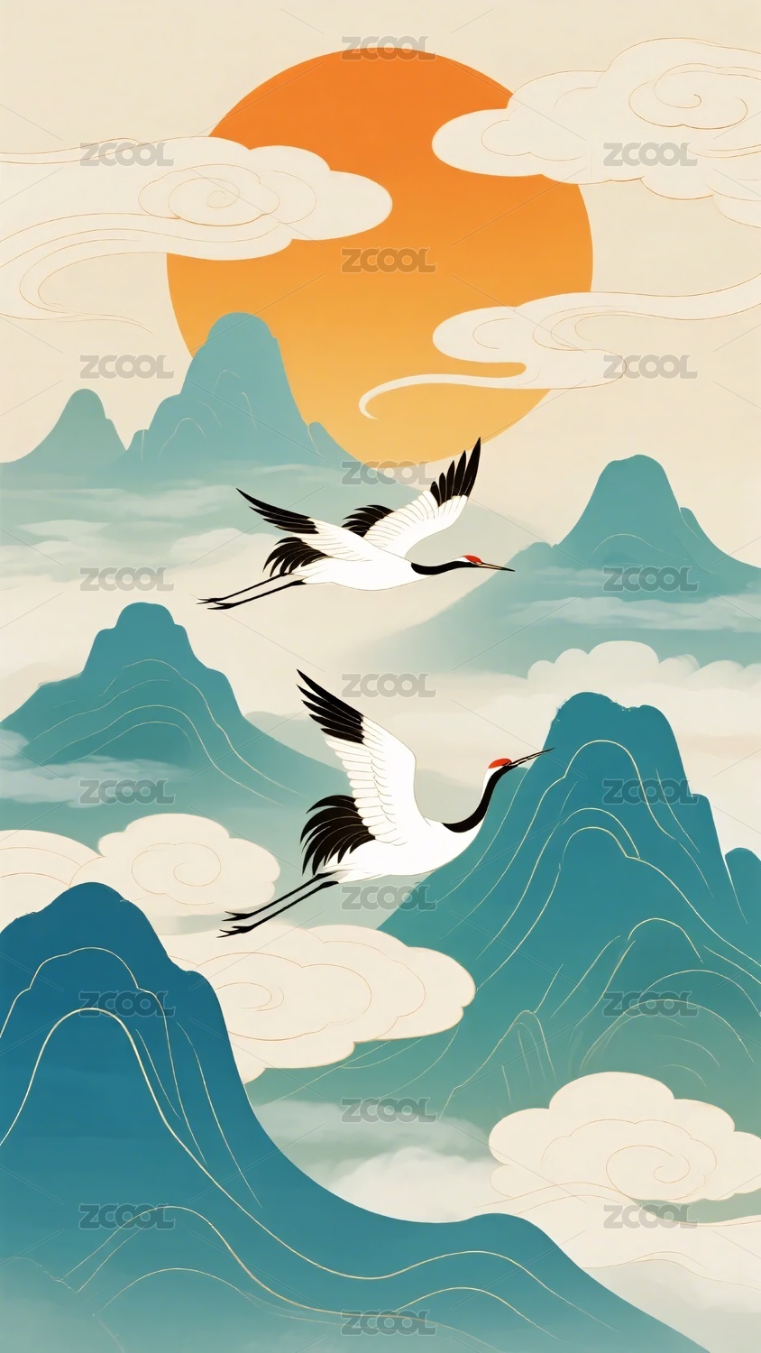 山水,太阳,云朵,插画,自然,风景,飞鸟,天空,元素,画面