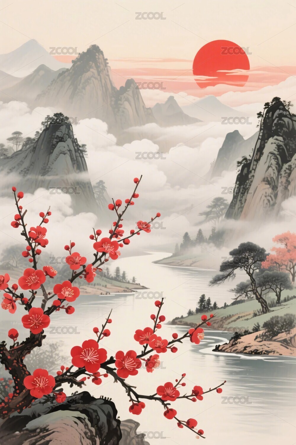 红梅,红日,云雾,风景,插画,自然,美景,中式,意境,画面元素