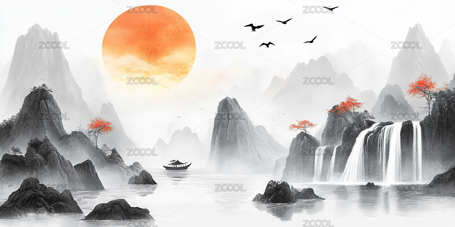 山水,红日,飞鸟,小船,瀑布,红梅,插画,意境,中国风,水墨画