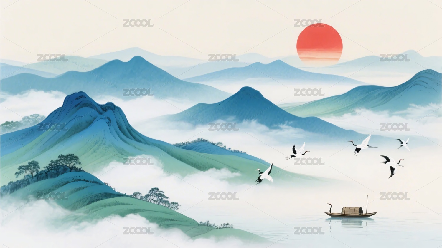山水,落日,飞鹤,小船,云朵,插画,风景,自然,意境,中式