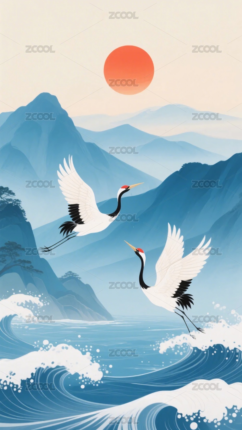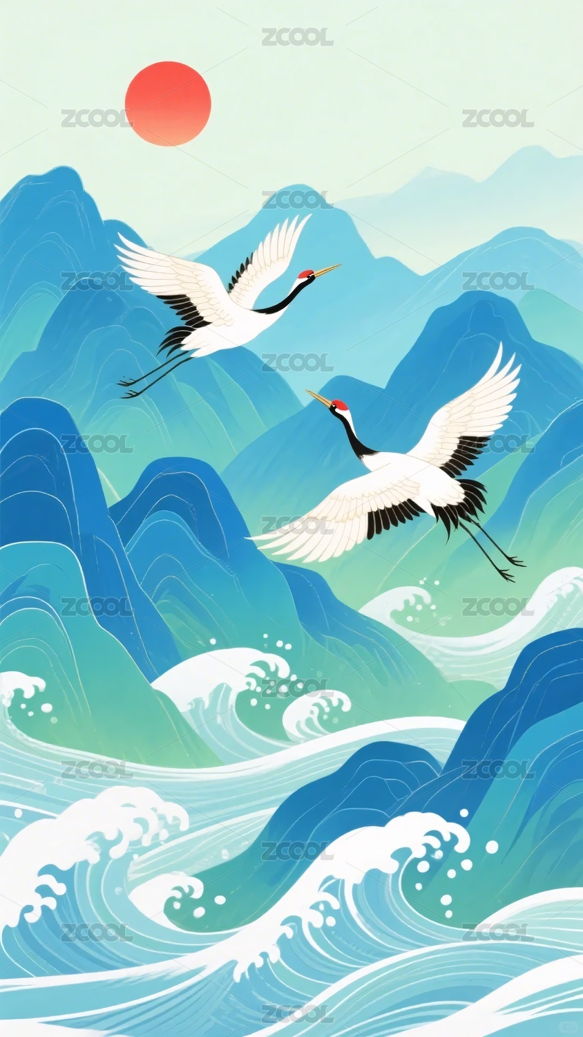 双鹤,山水,海浪,红日,插画,风景,元素,自然,飞鸟,中国风