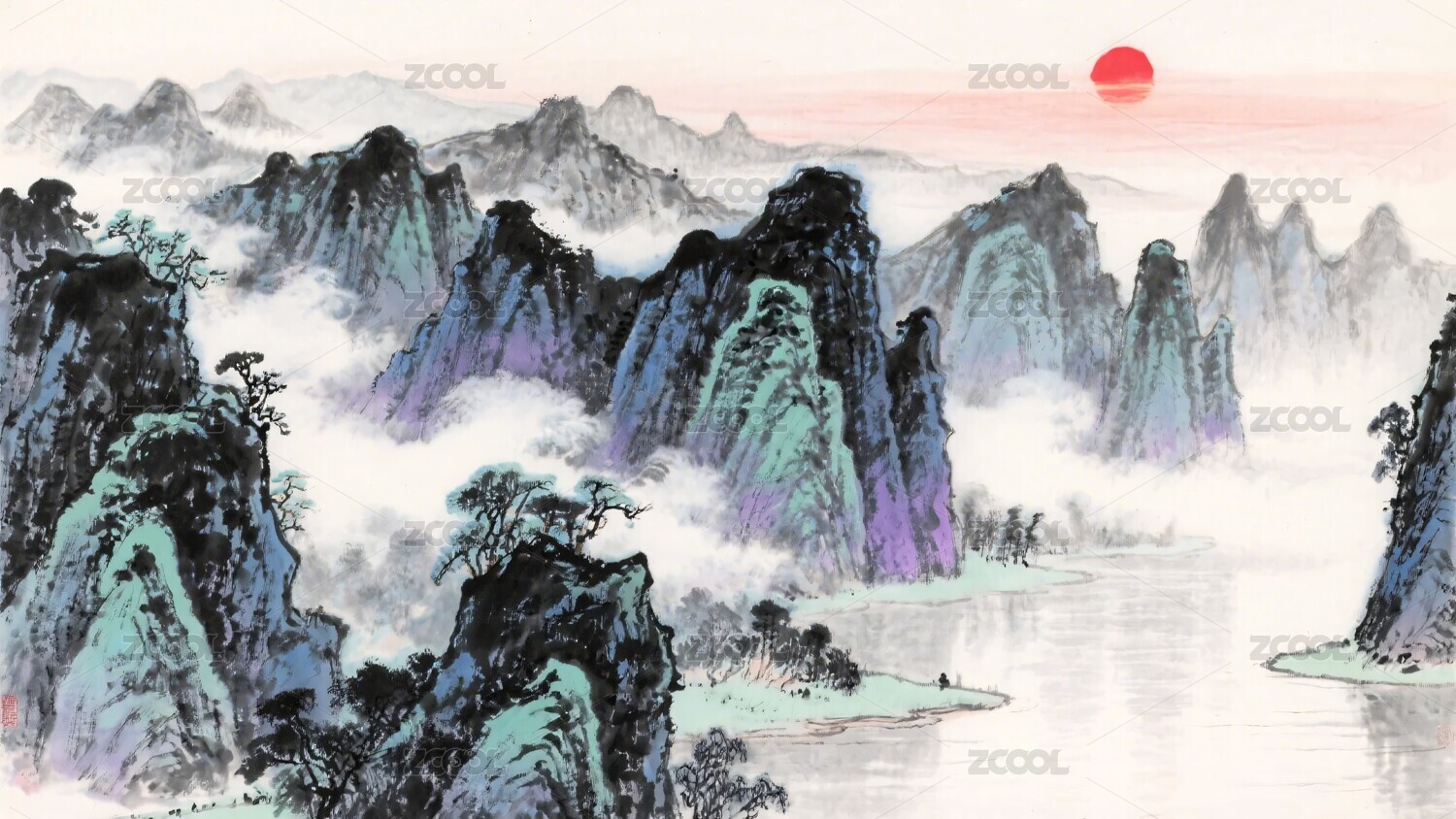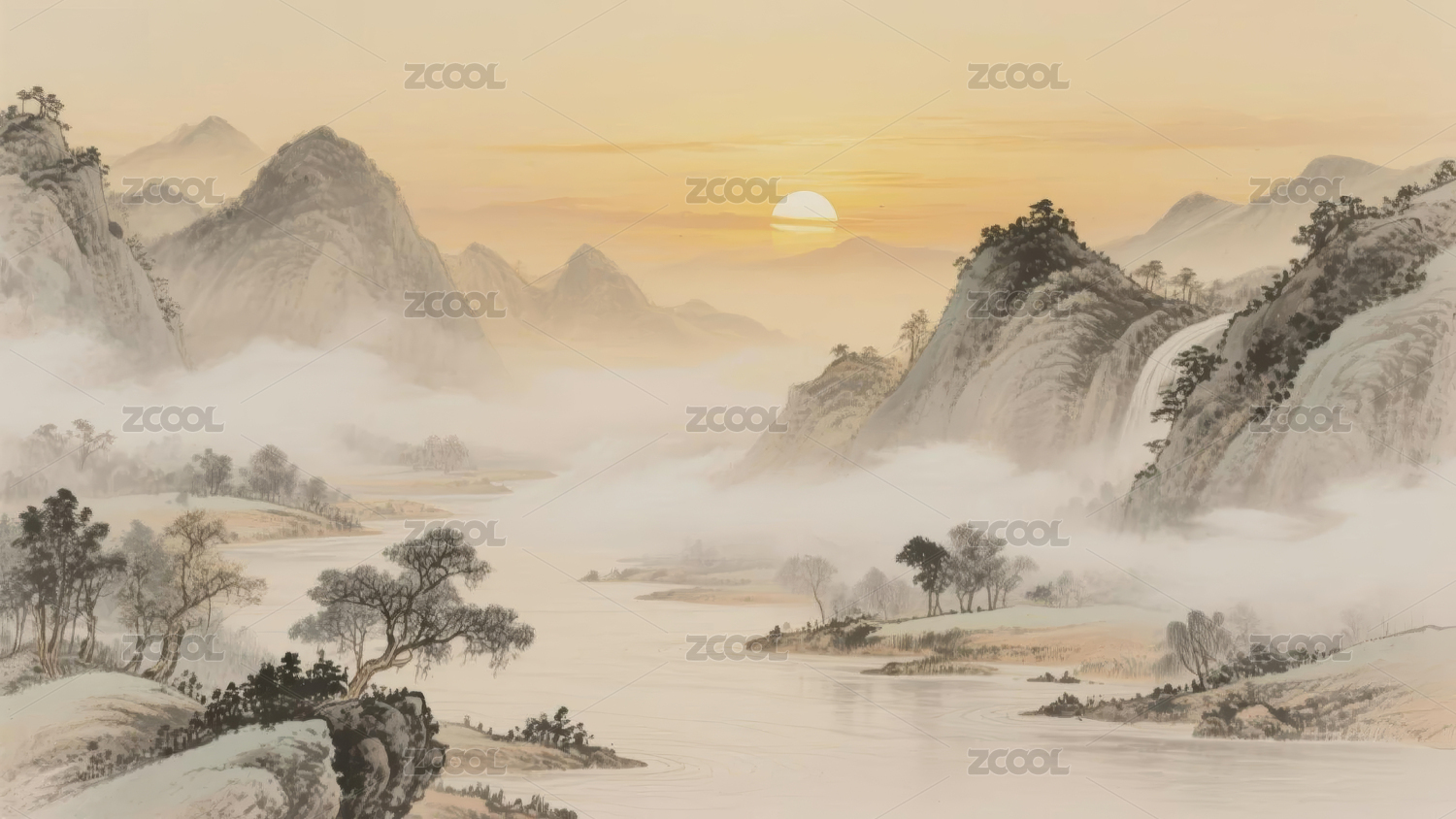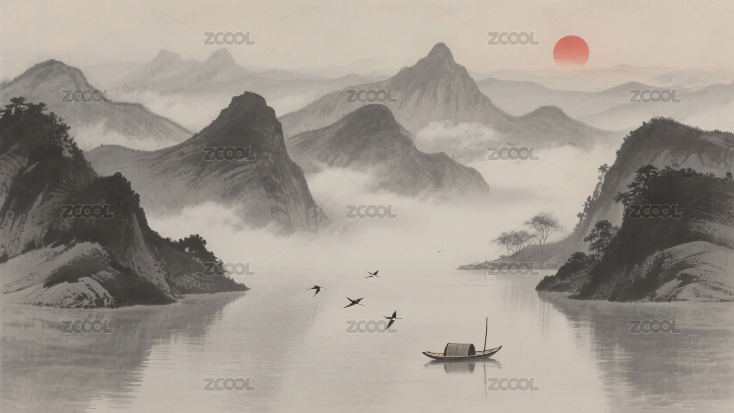 山水,日出,飞鸟,小船,水墨画,插画,风景,自然,云雾,山峰