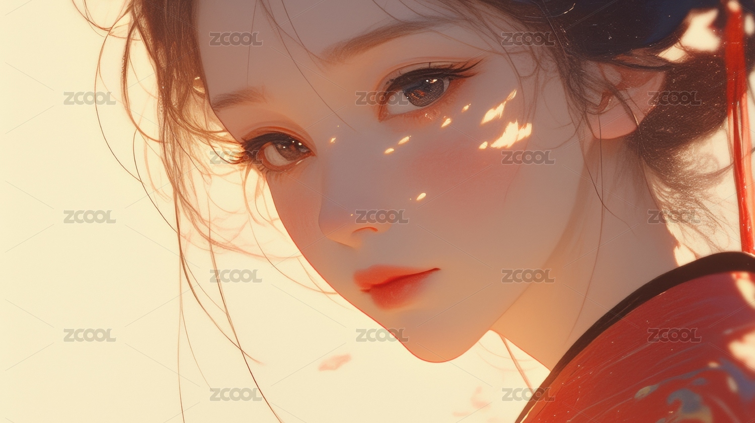 古风女子身着红衣低头沉思