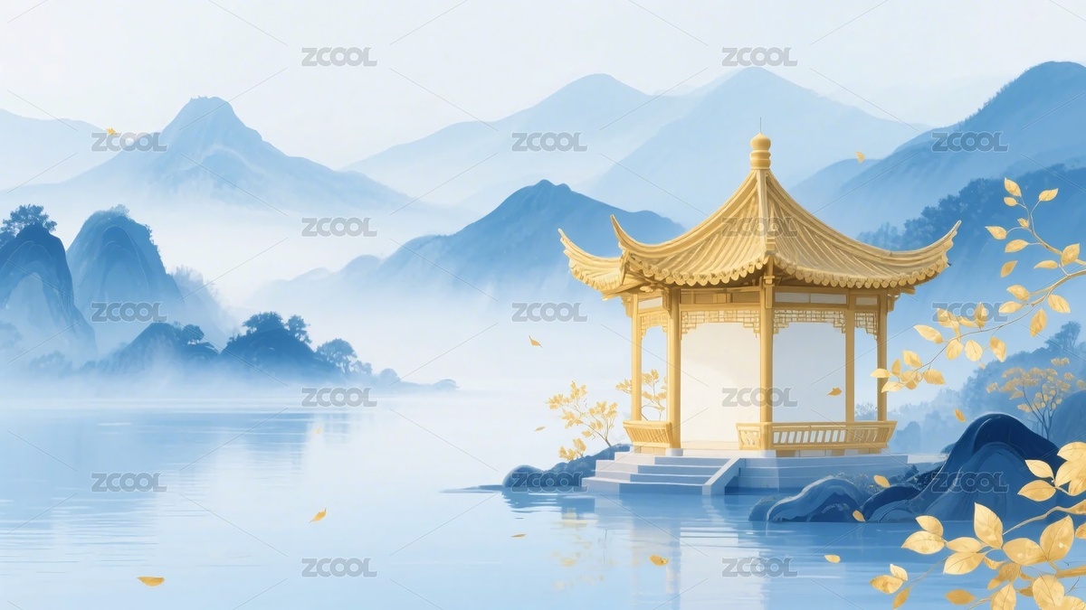 金色湖畔亭台山水风景图