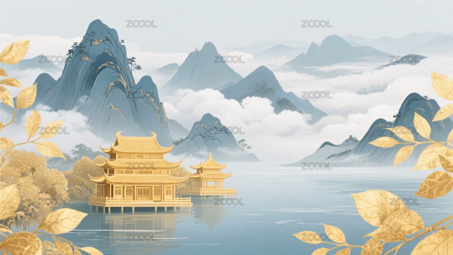 中式山水金殿插画美景
