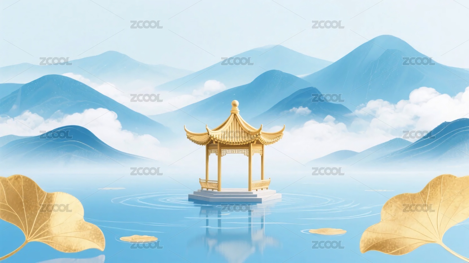 山水间的金色亭子插画