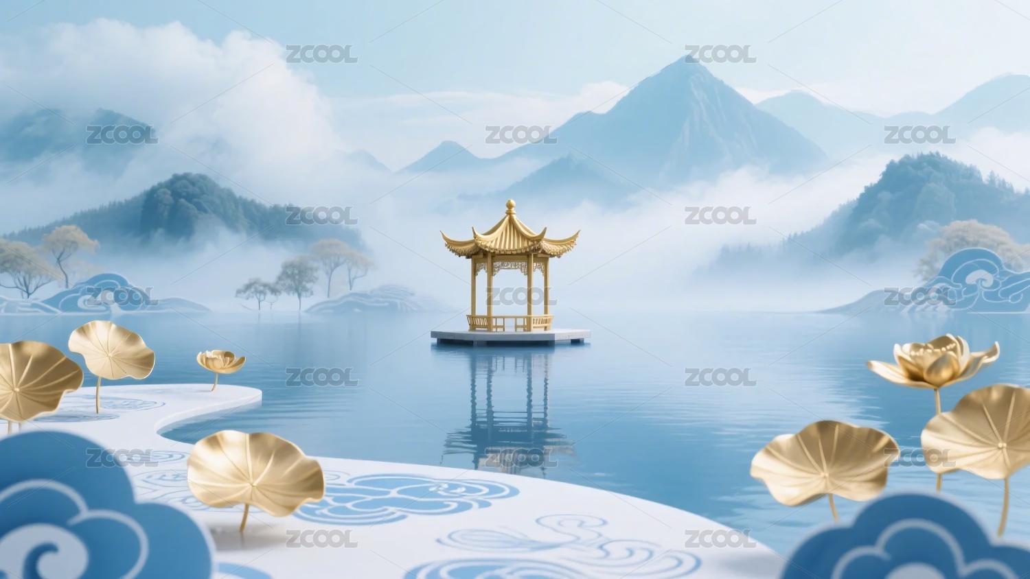 中式山水金殿荷花美景图