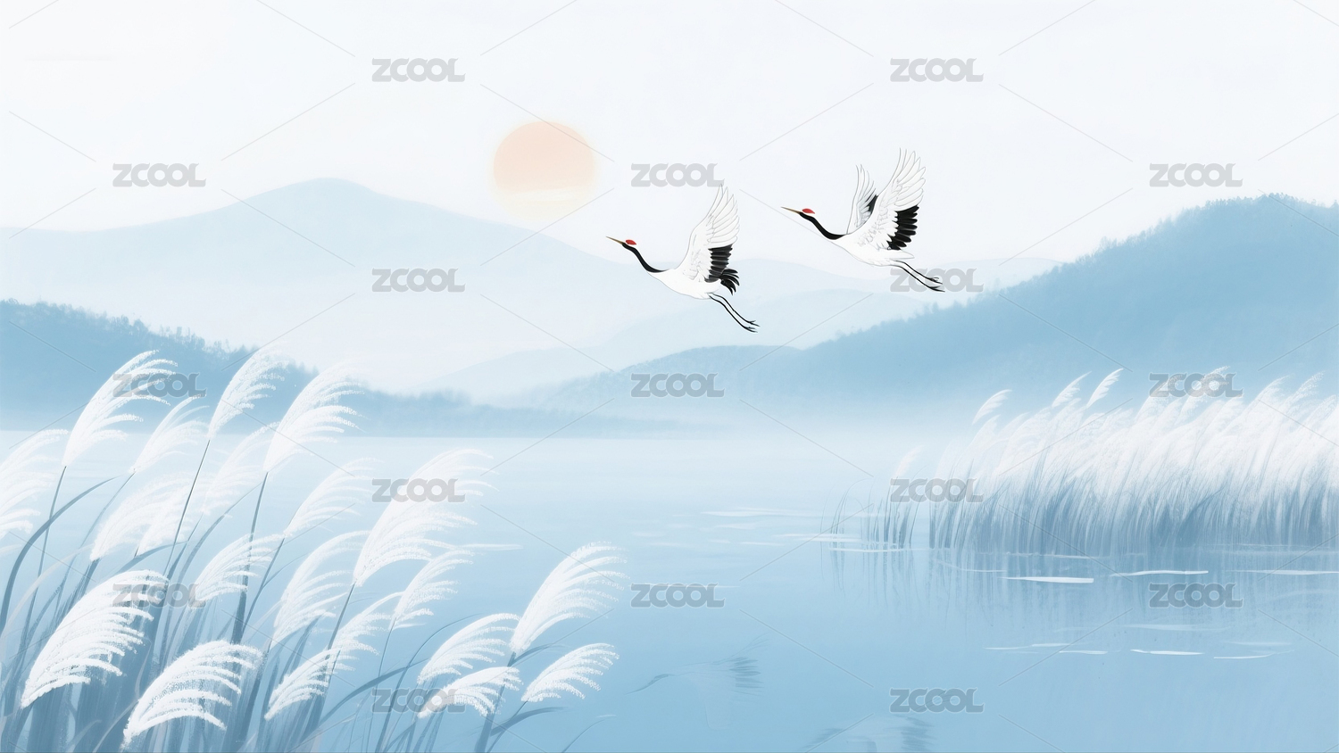 白露节气丹顶鹤简约山水红日背景