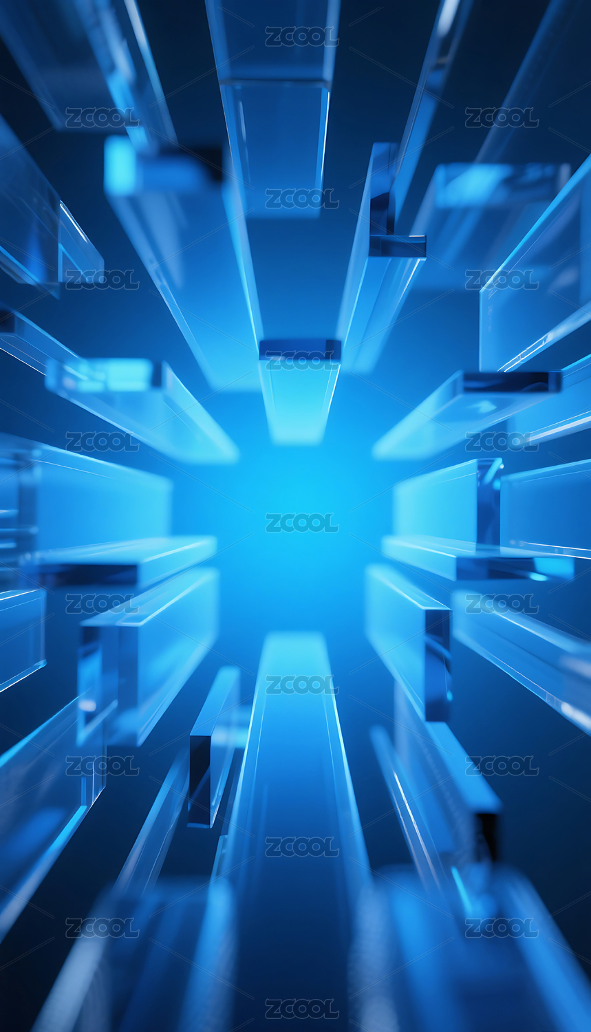 蓝金色立体玻璃条块从中间向四周扩散背景