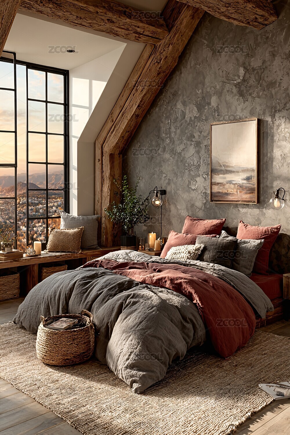 卧室,阁楼,枕头,被子,绿植,灯具,木质家具,窗户,室内场景,温馨