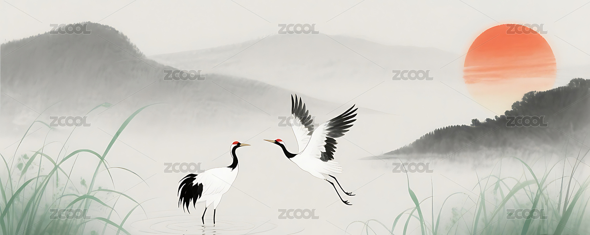 白露,节气,丹顶鹤,山水,水墨,简约,红日,背景,朦胧