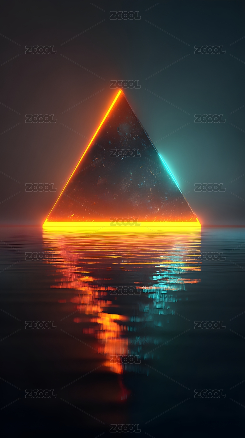 发光三角体倒映水面未来科技感