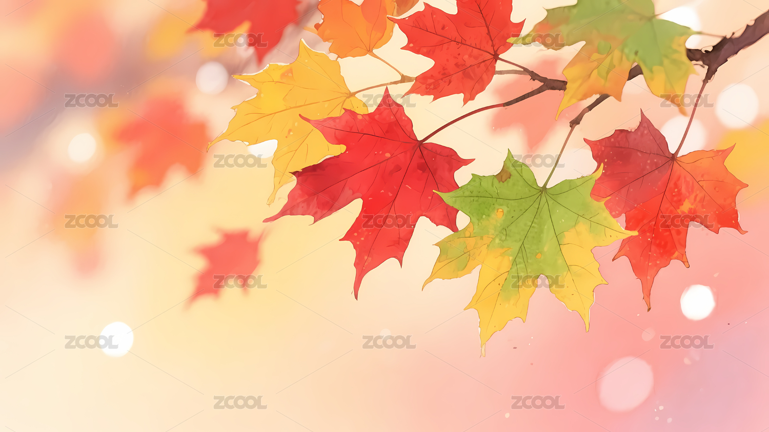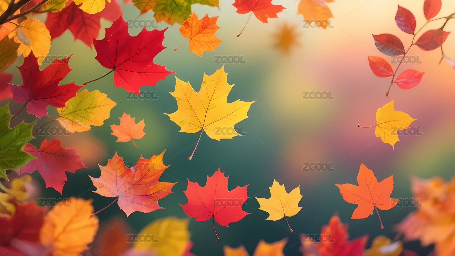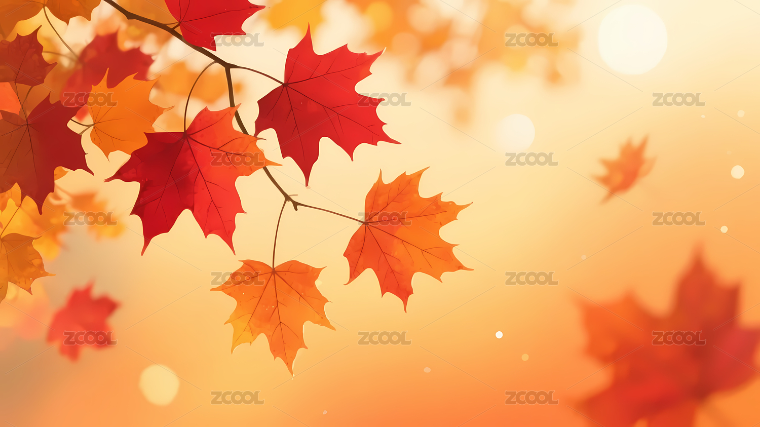 蓝色,秋叶,橙色,红色,黄色,渐变,天空,树枝,飘落,粉色
