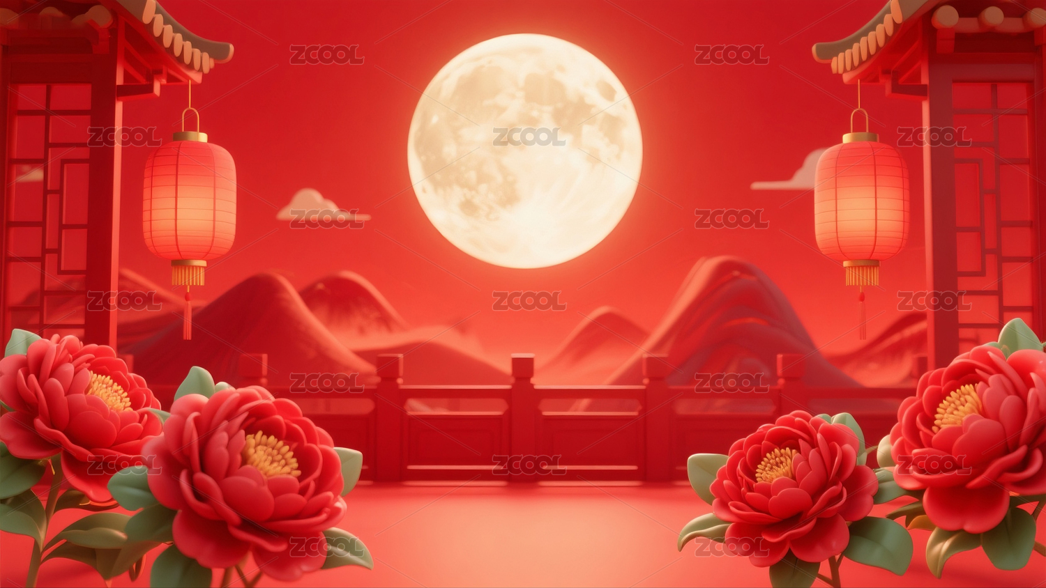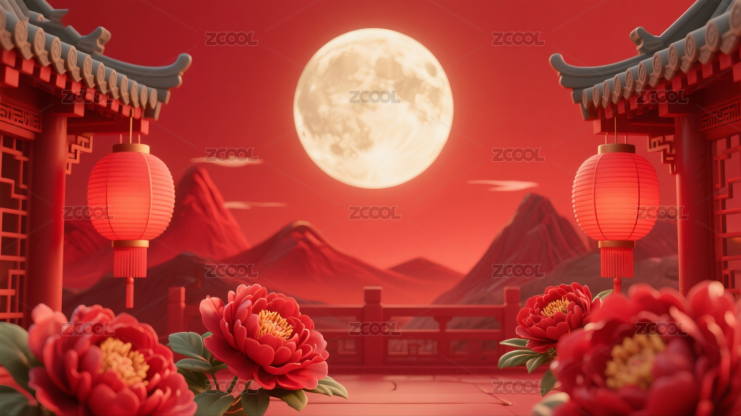 自然,红色,山脉,天空,粉色,樱花,夜晚,亭子,满月,云雾