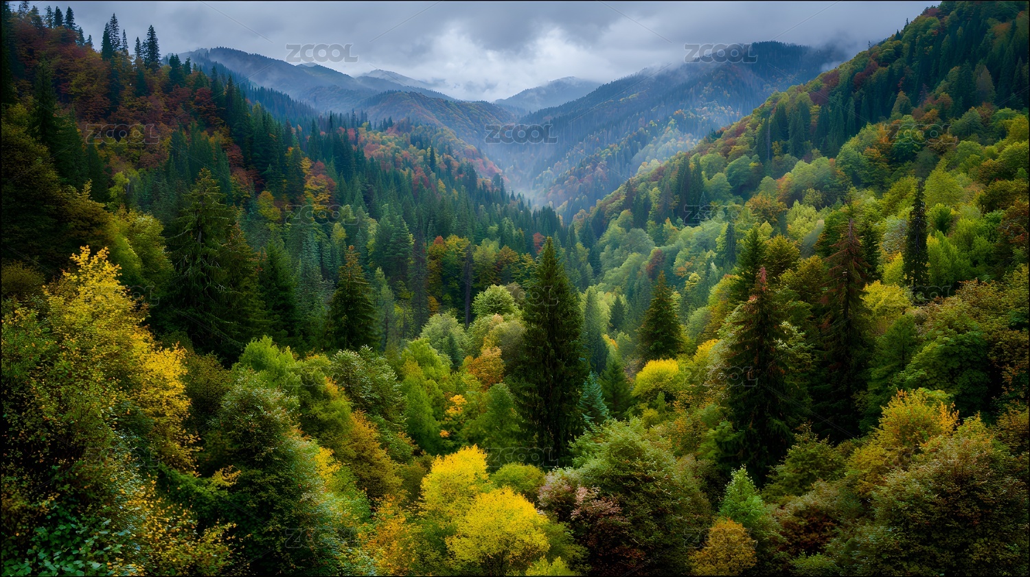 中国四川阿坝州奶子沟彩林云雾缭绕悬崖峭壁