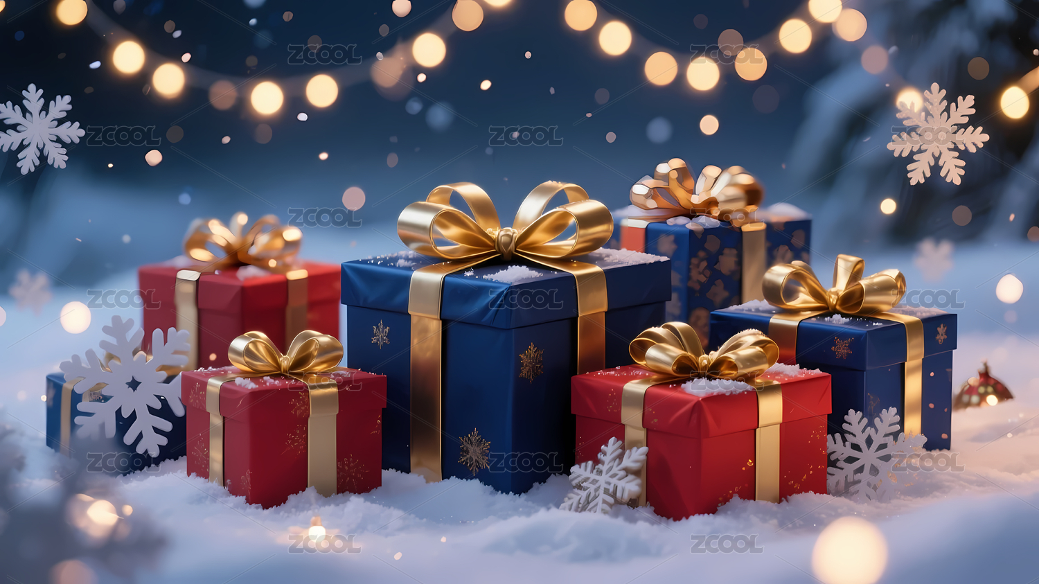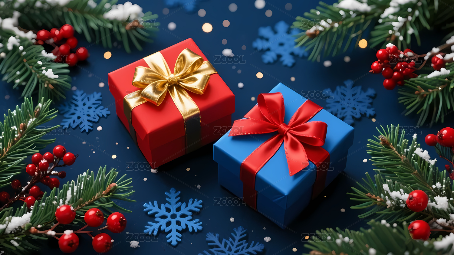 蓝色,红色,绿色,礼物盒,松枝,节日,雪花,蝴蝶结,浆果,圣诞球