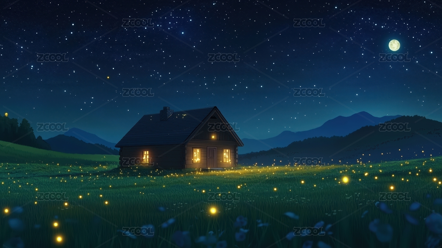 大暑节气夏天夜晚户外房屋消暑降温场景插画