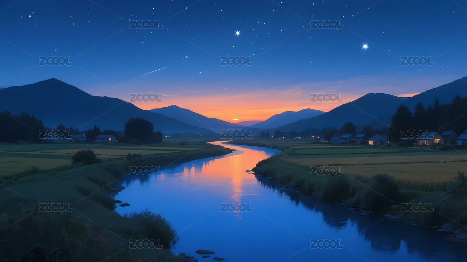 深蓝,倒影,宁静,星空,灯光,水面,夜景,房屋,山脉,暖黄