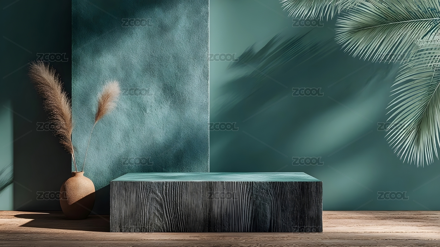 棕榈叶背景下的空展示台