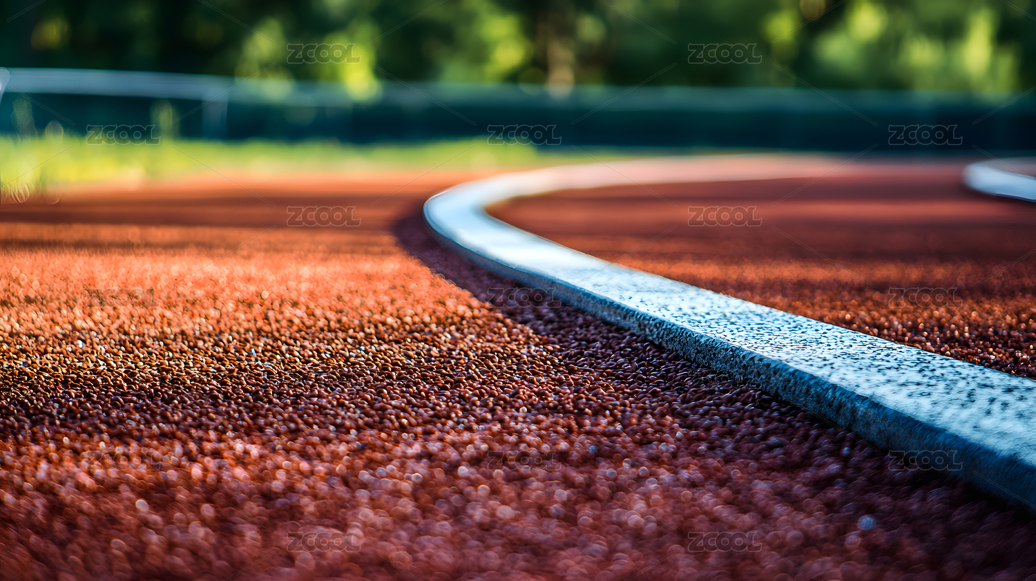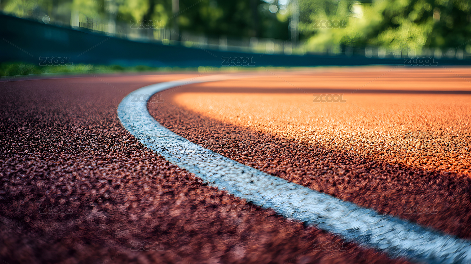 在阳光照射下的红色田径跑道弯道