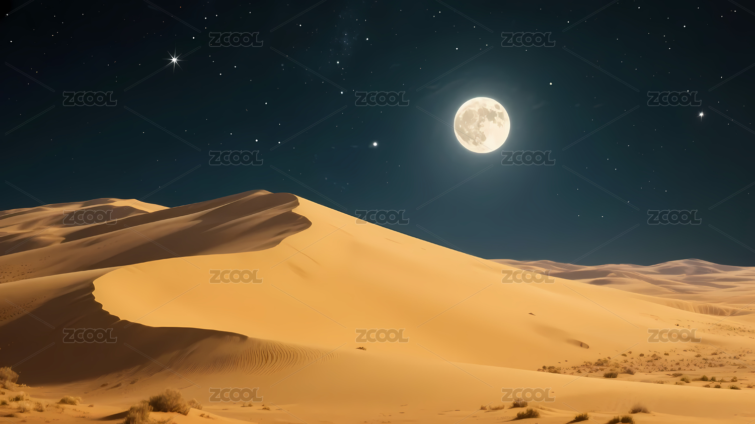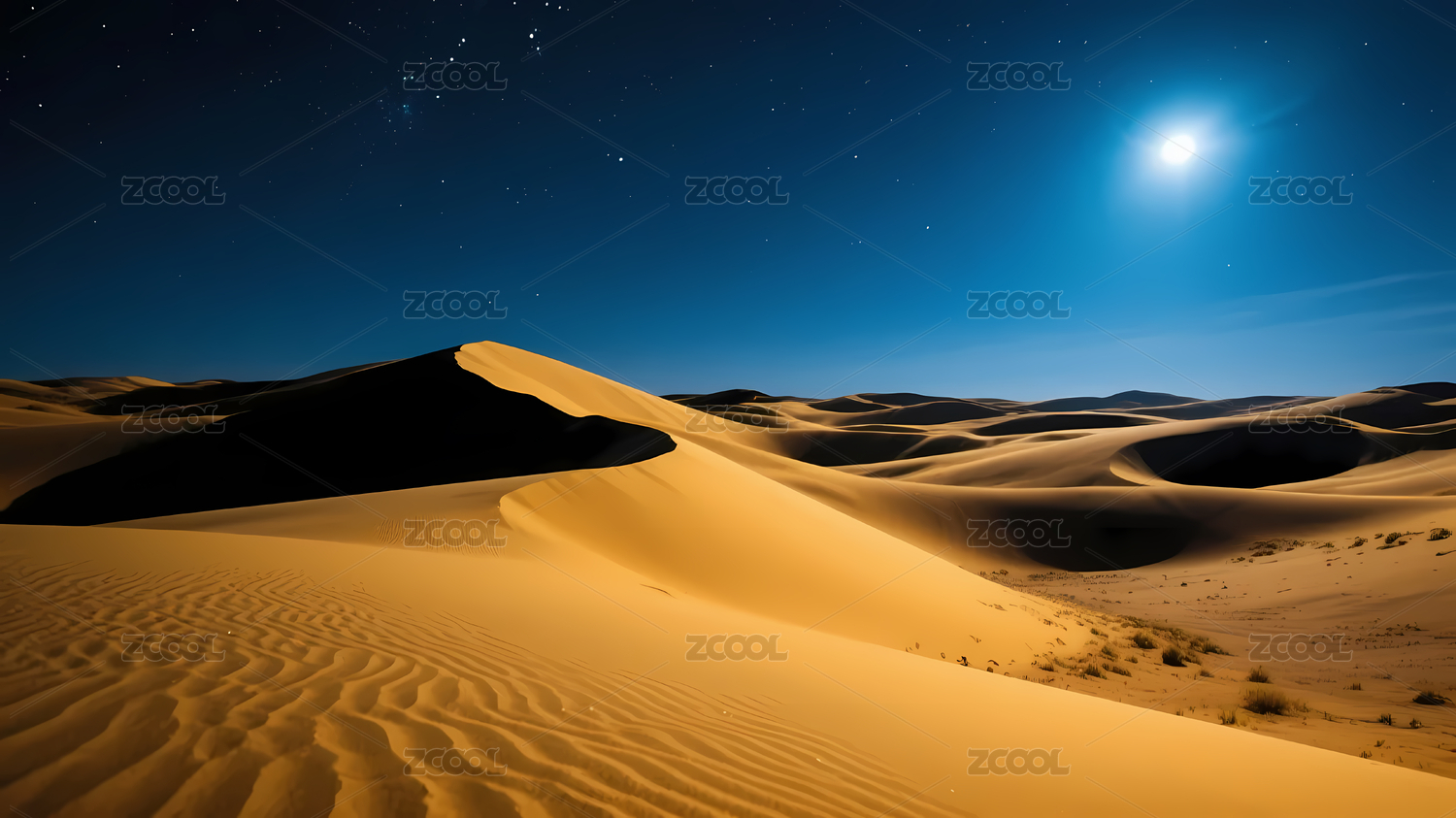 宁静,蓝色,温暖,壮丽,星空,夜空,沙漠,沙丘,满月,金黄