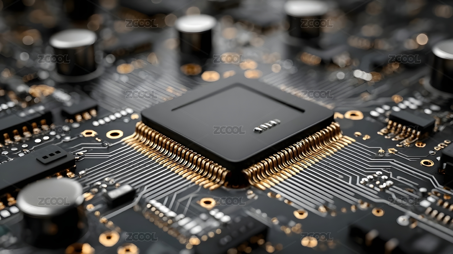 电路板中央的黑色芯片特写照片