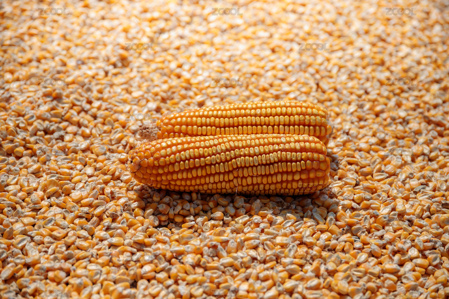 秋天丰收的晒干黄玉米棒和散落在地的玉米粒