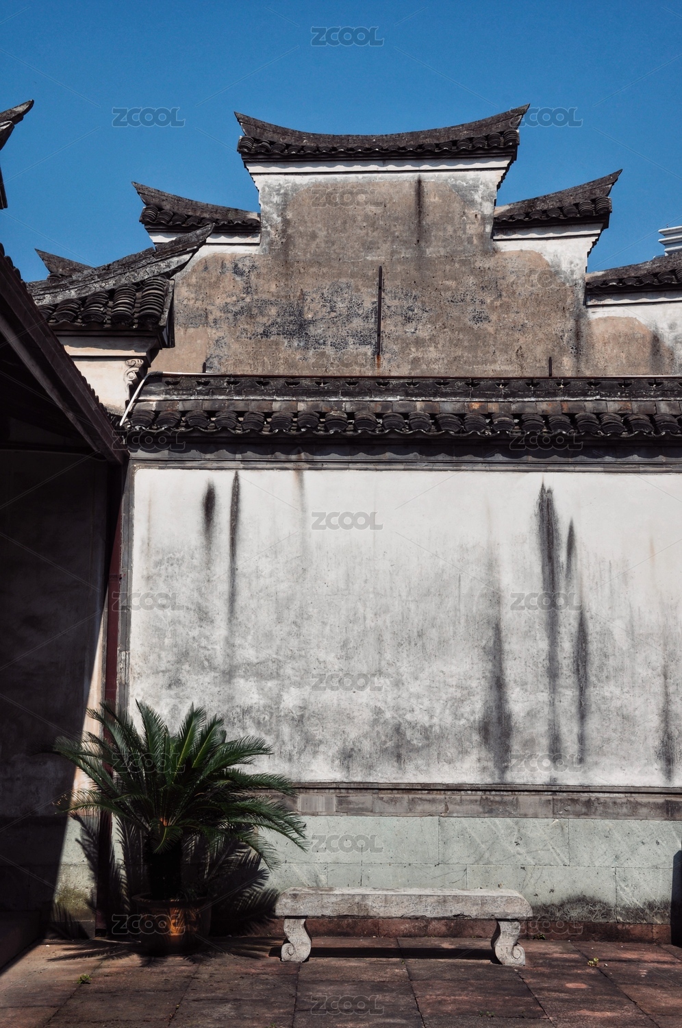 低角度拍摄白墙灰瓦民居和铺路石地面