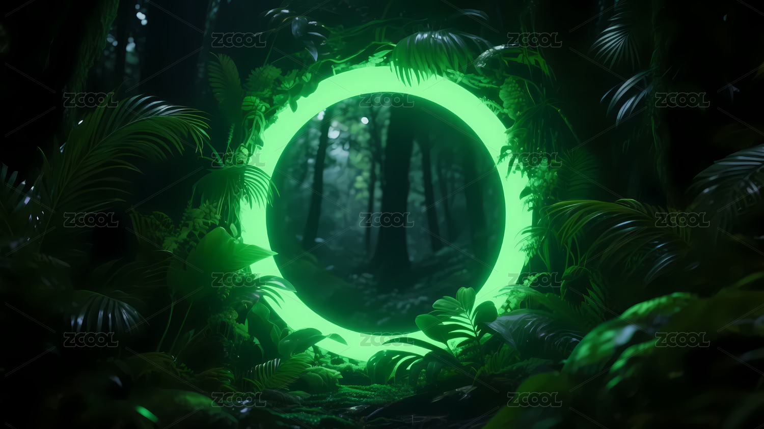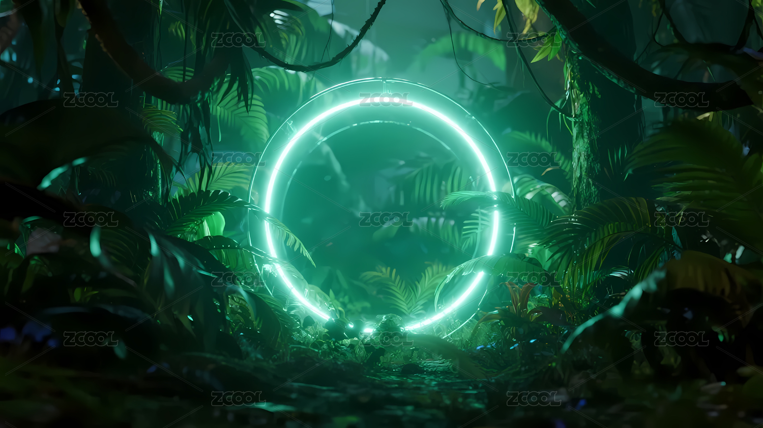 绿色原始森林中的霓虹光环